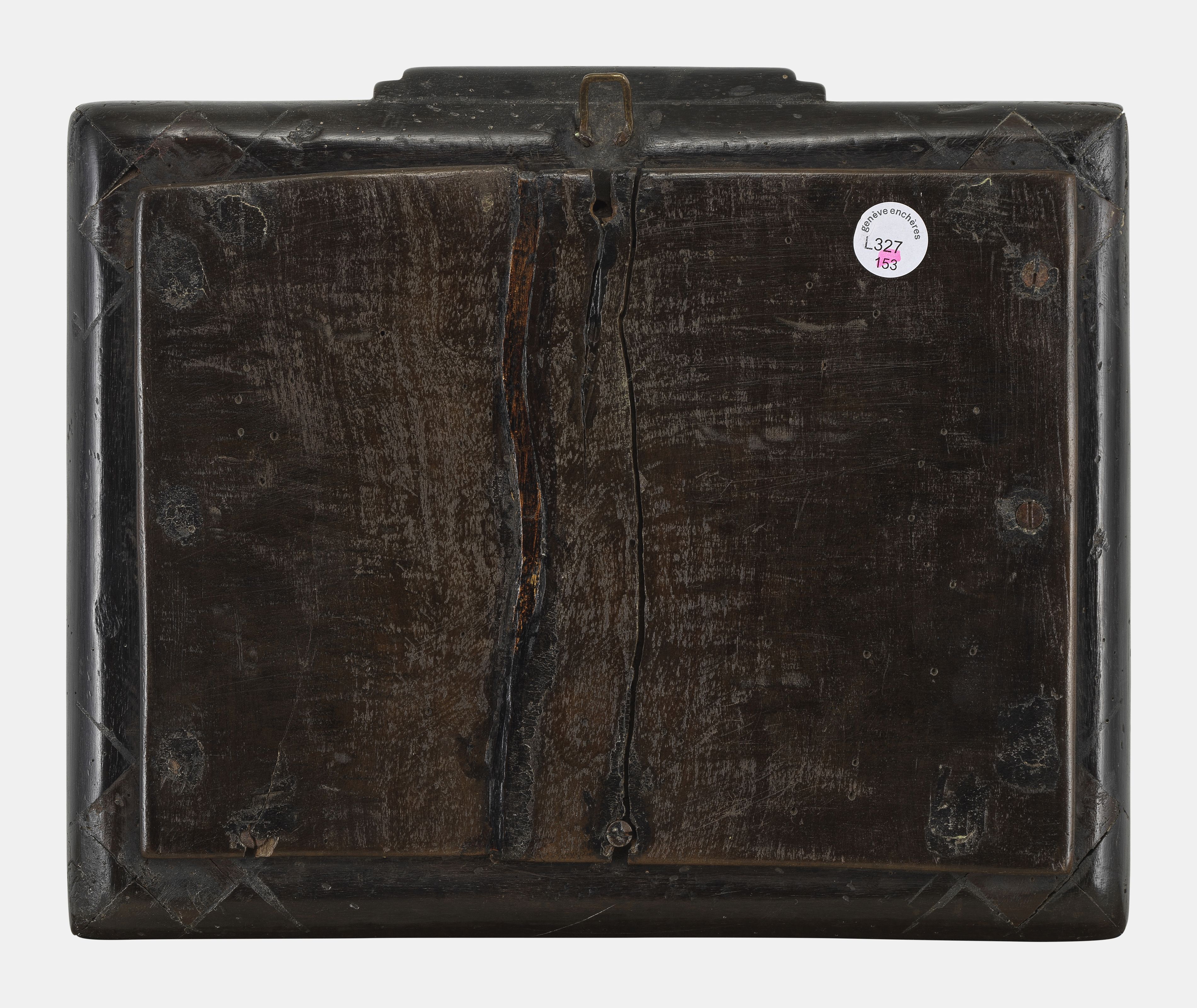 Ivoire sculpté en bas-relief, cadre en ébène et incrustation d’ivoire à motif d’armoiries, 23,5x28,5 cm