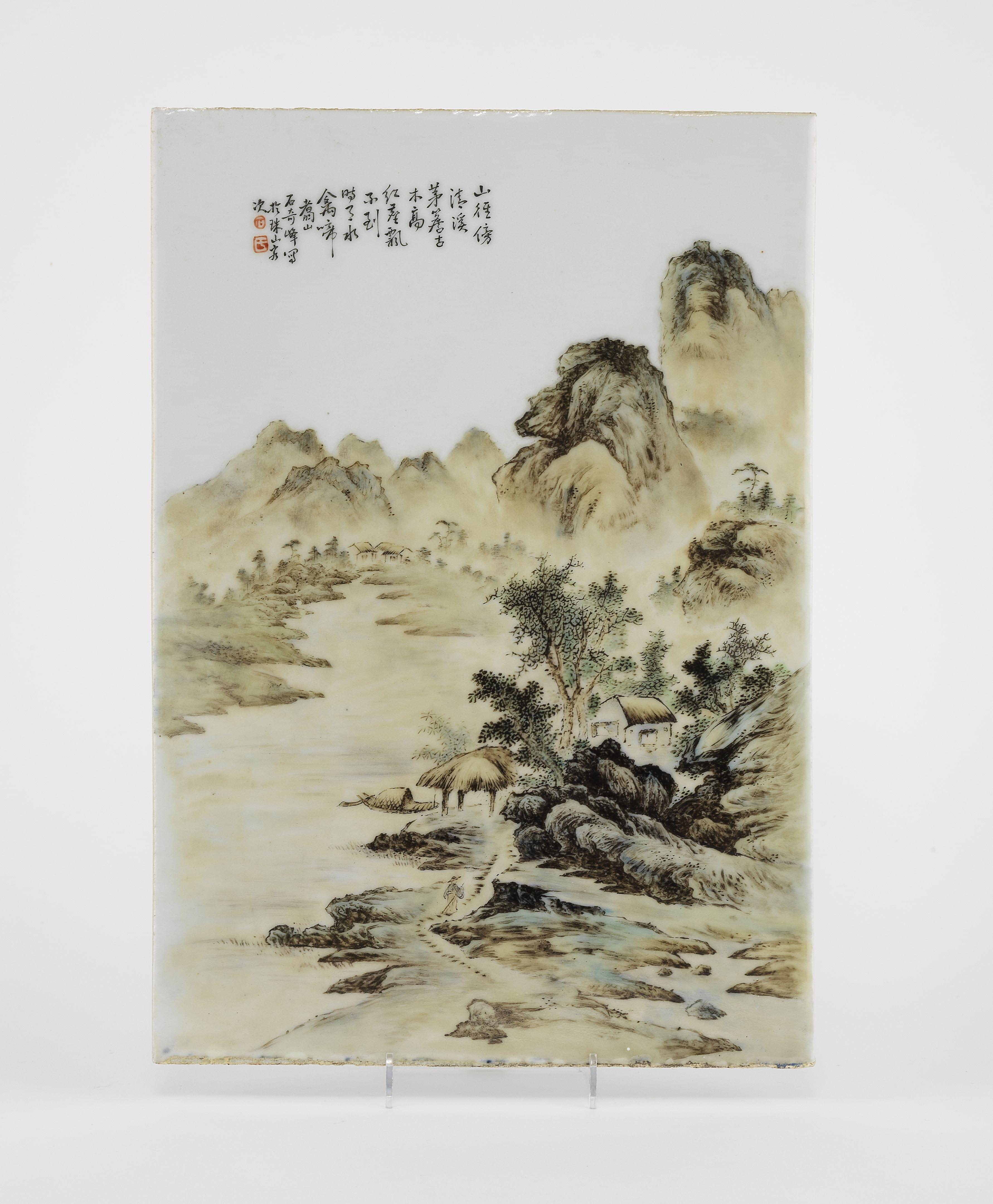 Porcelaine émaillée polychrome à motif d'un paysage accompagné d'un poème, 37x25 cm