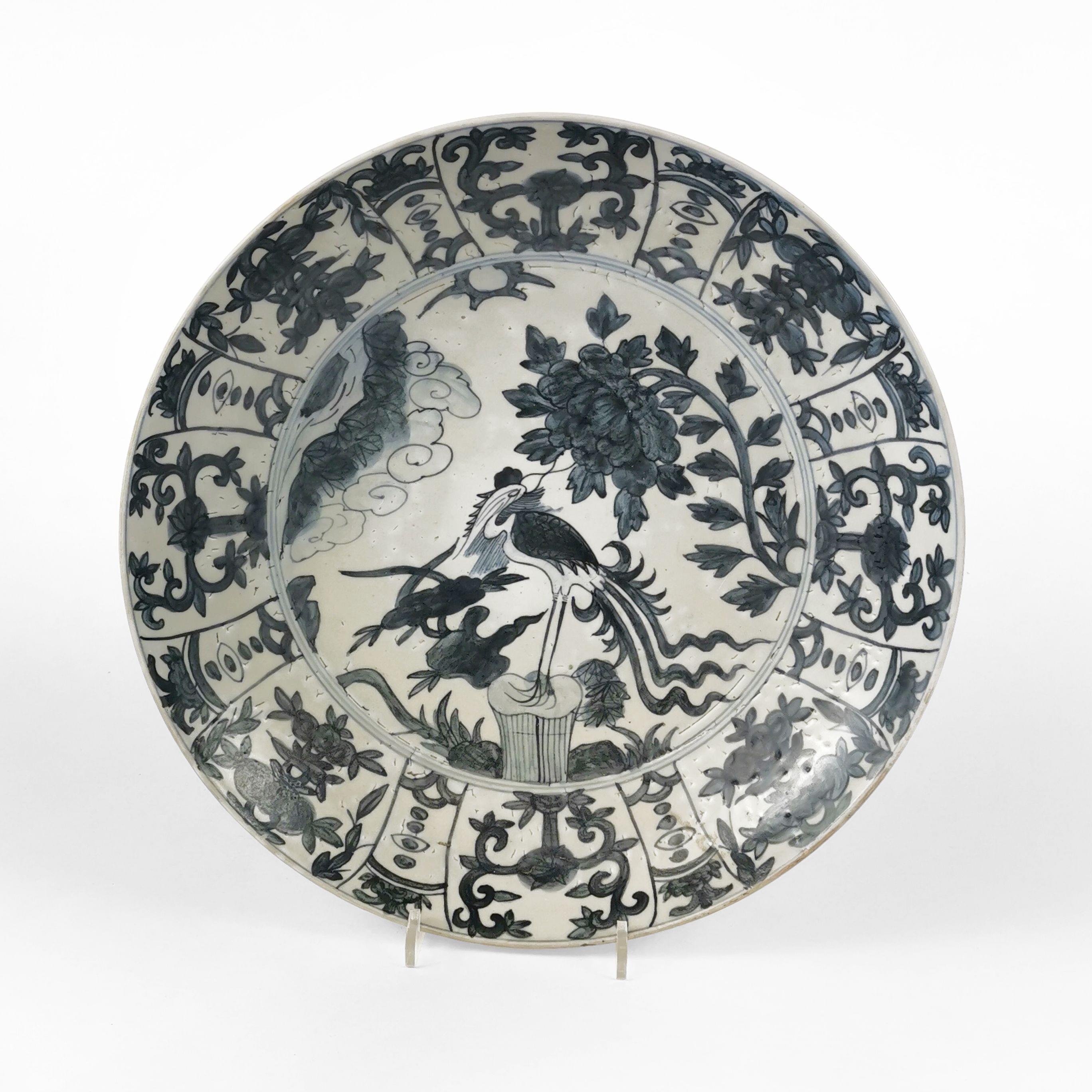 Porcelaine émaillée bleu à décor d'un échassier et de motifs floraux, D 37,5 cm