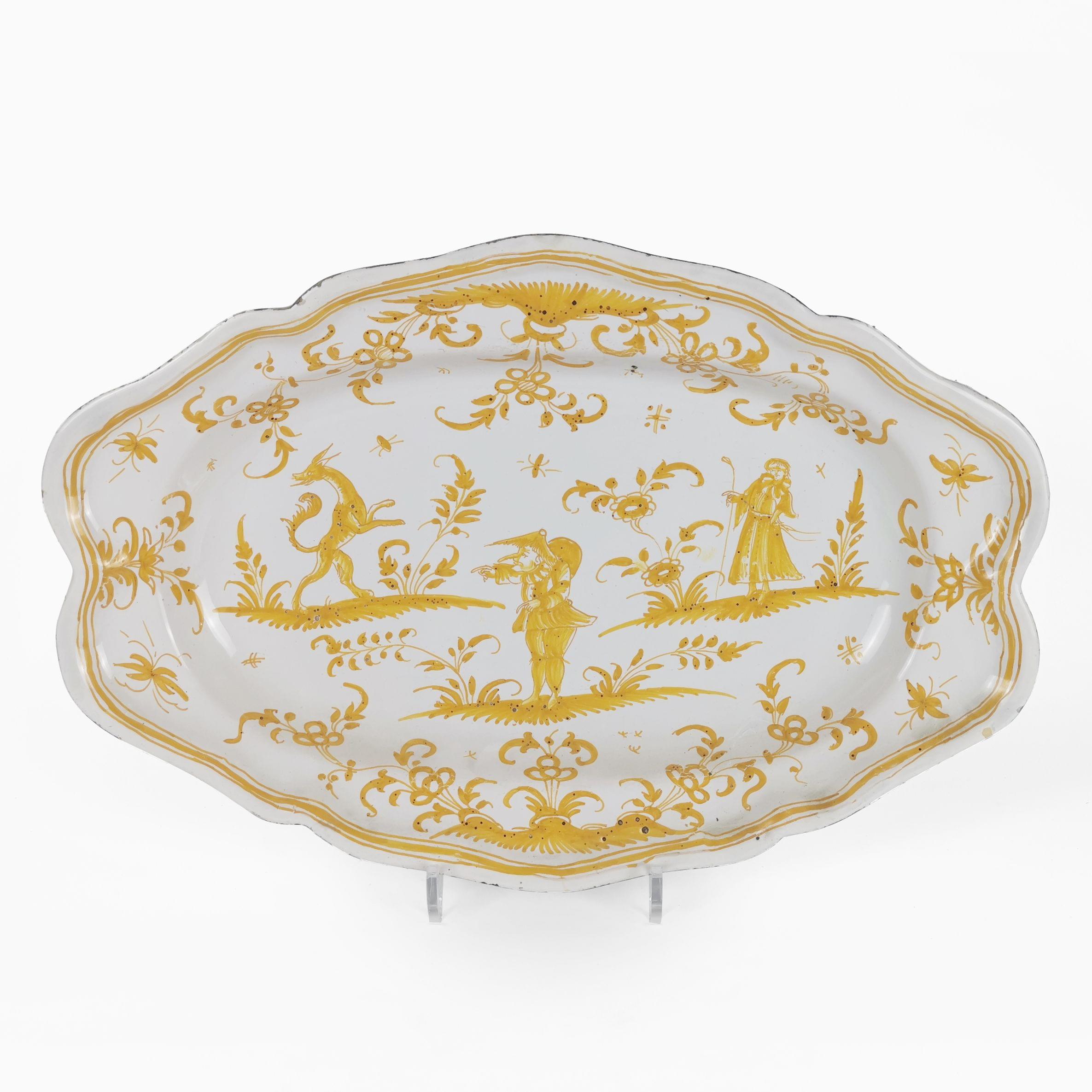Faïence émaillée jaune antimoine à motifs de grottesques, L 43 cm