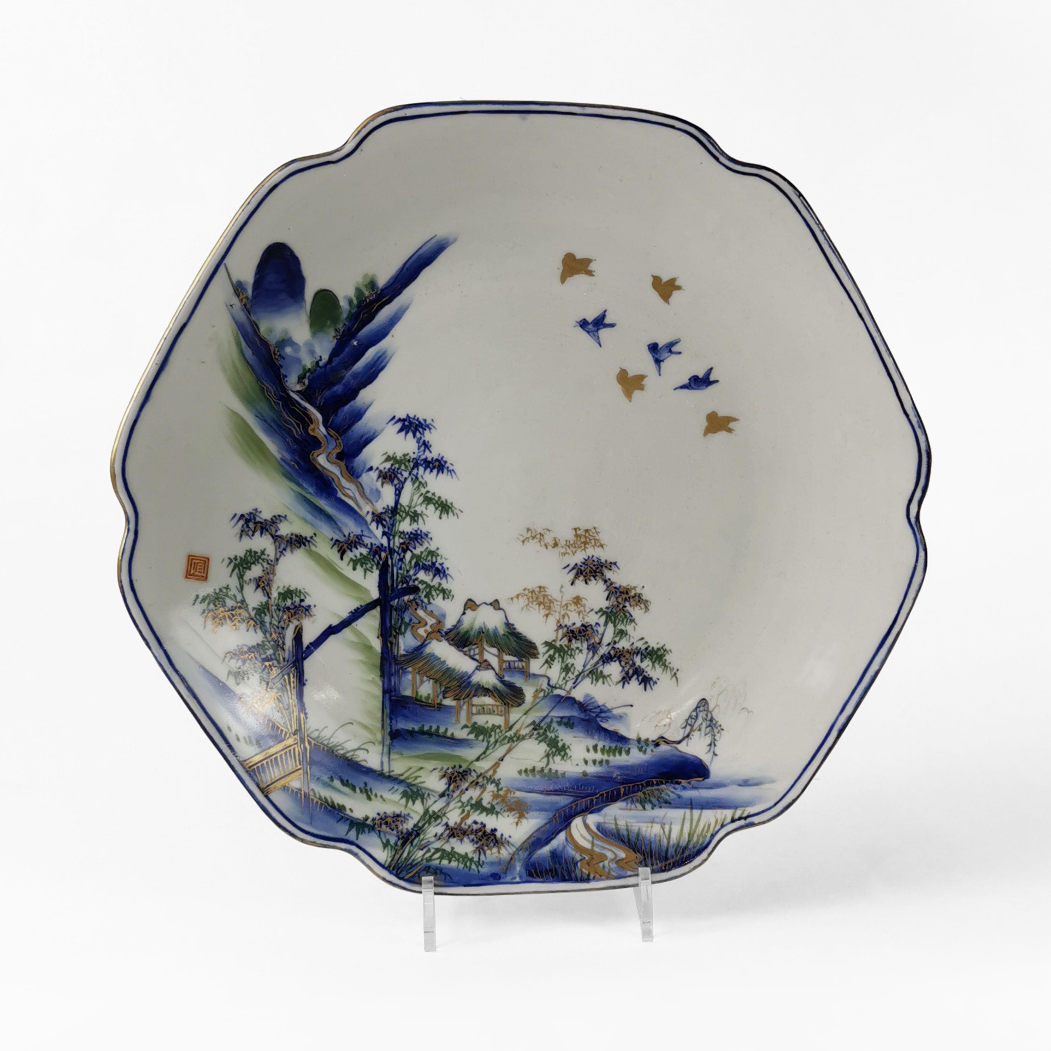 Porcelaine émaillée bleu blanc vert et or à motif d'un vol d'oiseaux dans un paysage, D 36 cm
