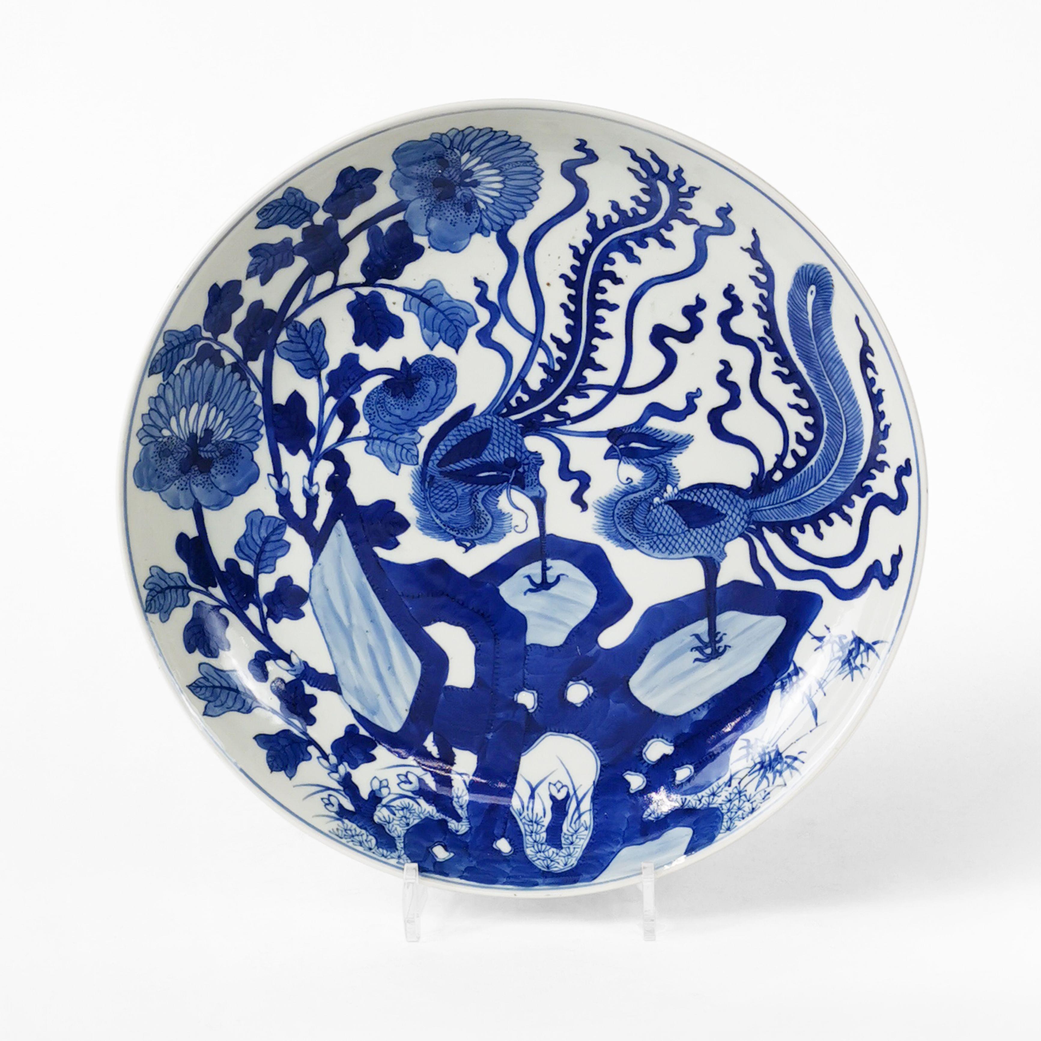 Porcelaine émaillée bleu blanc à motif phénix, D 34,5 cm