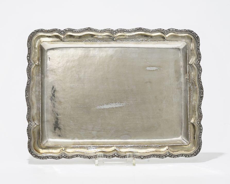 156. Grand plateau de service ovale à bordure ajourée de cannelures e...