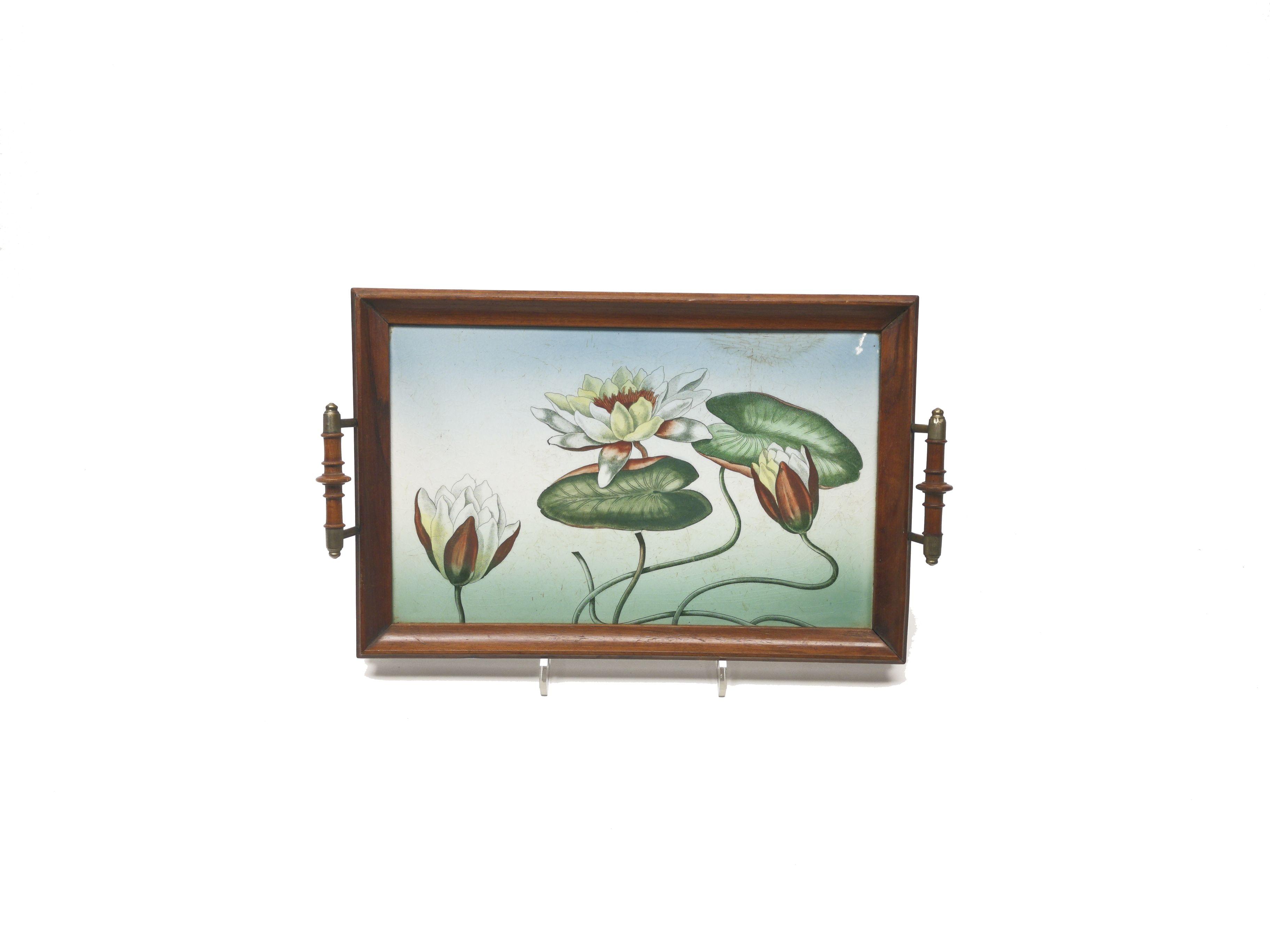 Céramique émaillée polychrome et bois, à décor de nénuphars, 23,5x 36 cm