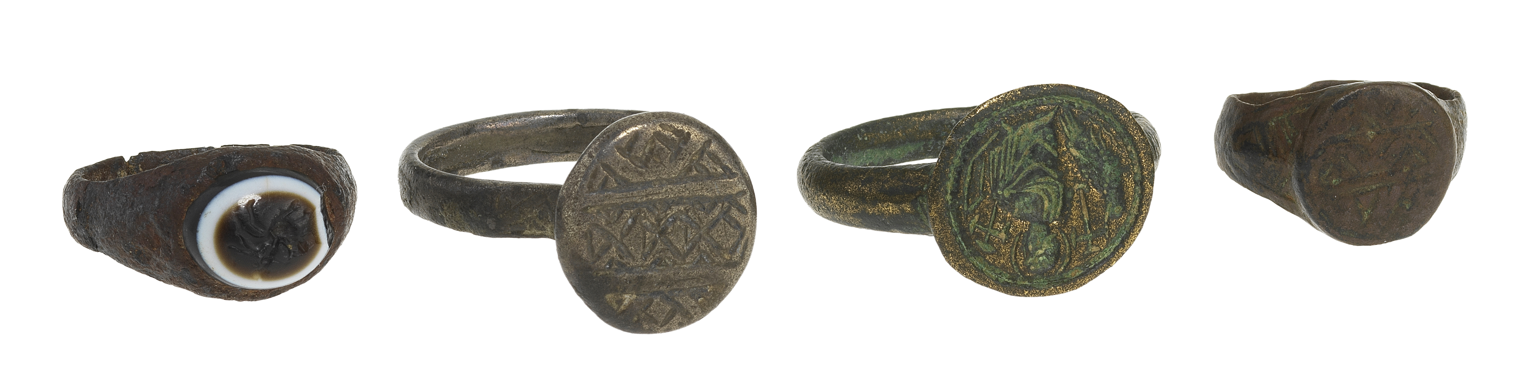 L'une sertie d'une intaille à motif de lion, les trois autres gr...
