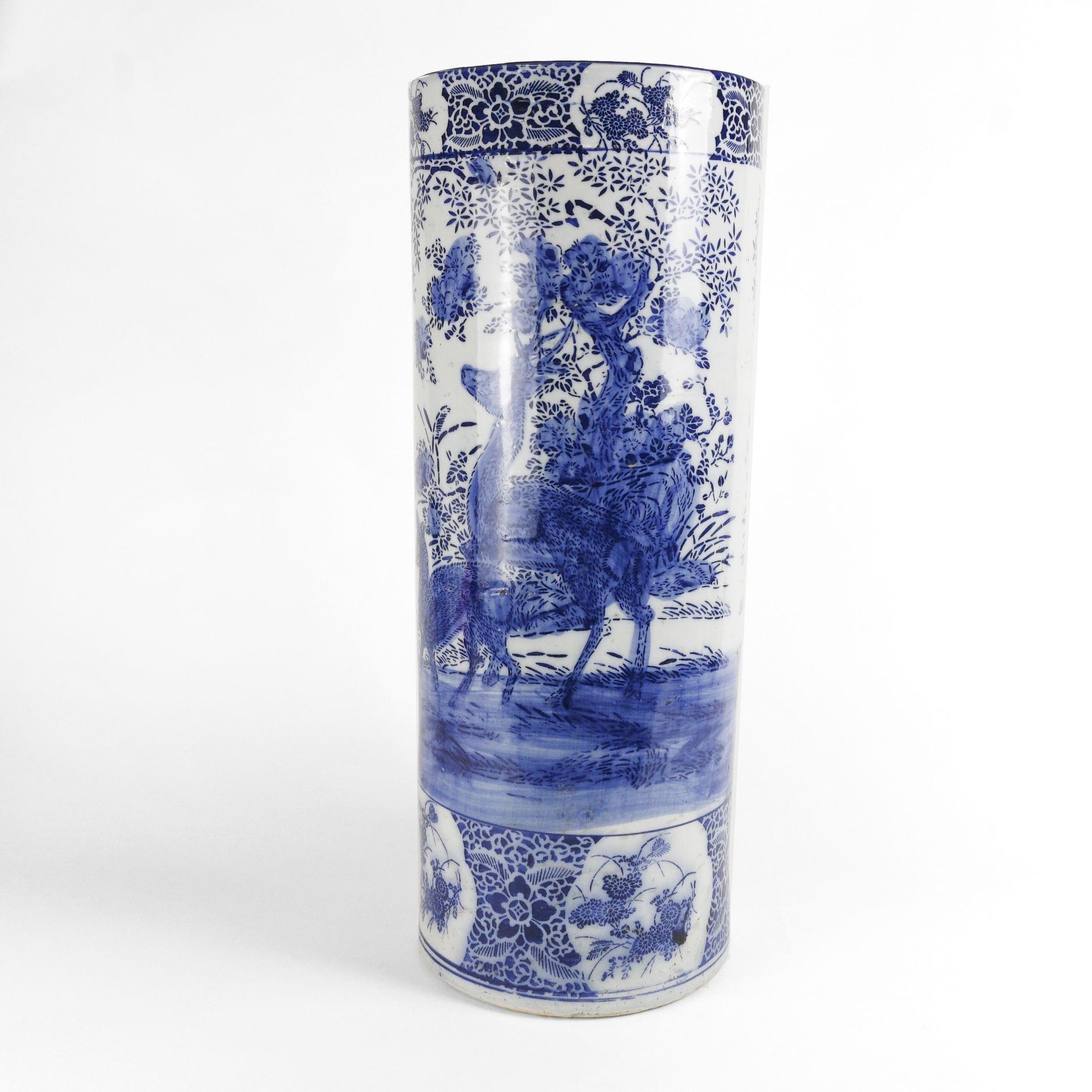 Porcelaine à décor peint au pochoir en bleu à décor de biches, H 61 cm