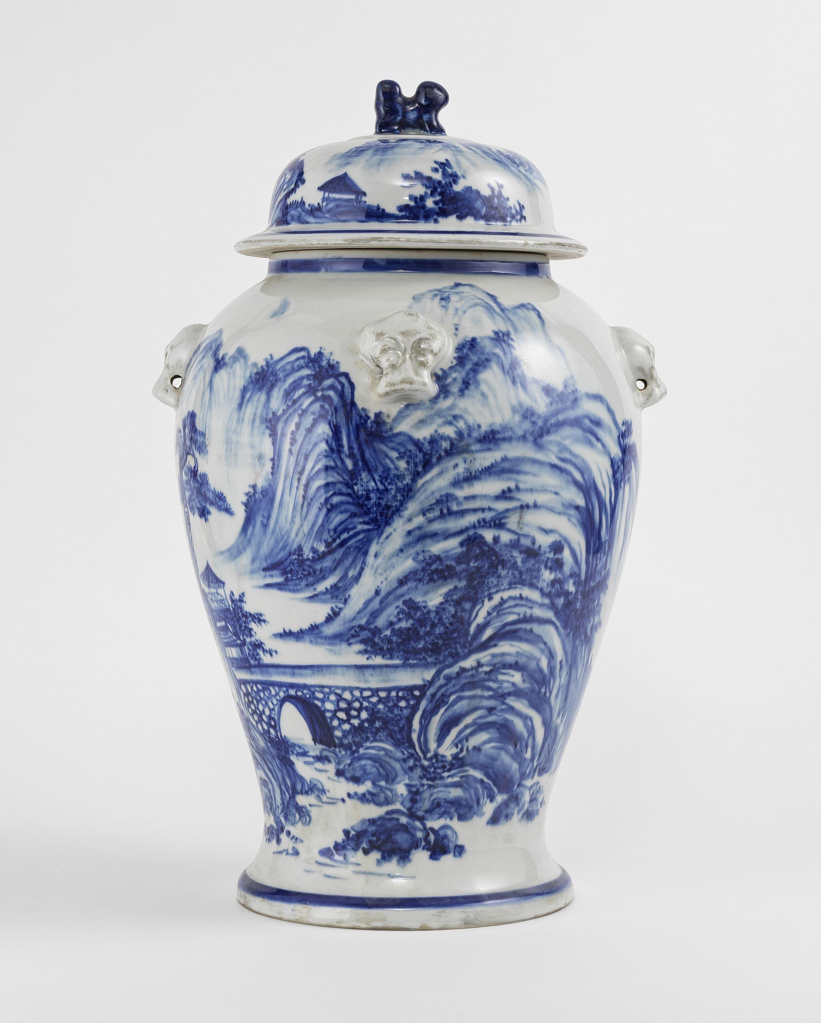 Porcelaine émaillée bleu blanc à motif de paysages de montagne, H 44 cm