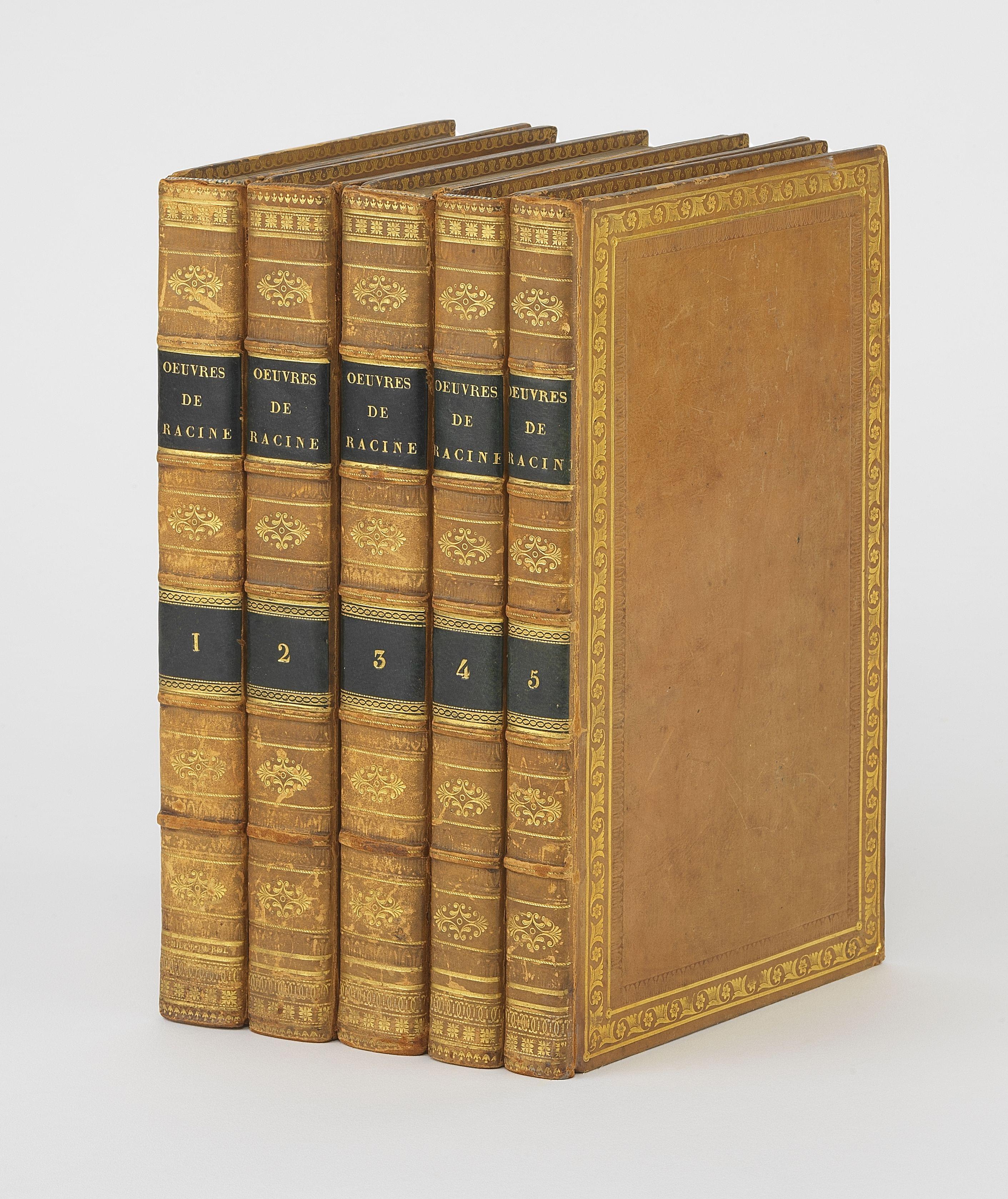 Cinq volumes in 8°, veau blond, dos à nerfs ornés, pièces de titre et de tomaison en veau noir, roulette poussée sur les plats, tranches dorées. Reliure de SIMIER, relieur du Roi. Belle édition, fort bien reliée, chacune des pièces est ornée d’un beau front. gravé d’après les dessins de Moreau le Jeune. De la Bibliothèque du duc de Nemours, fils du roi Louis-Philippe (charnières frottées).