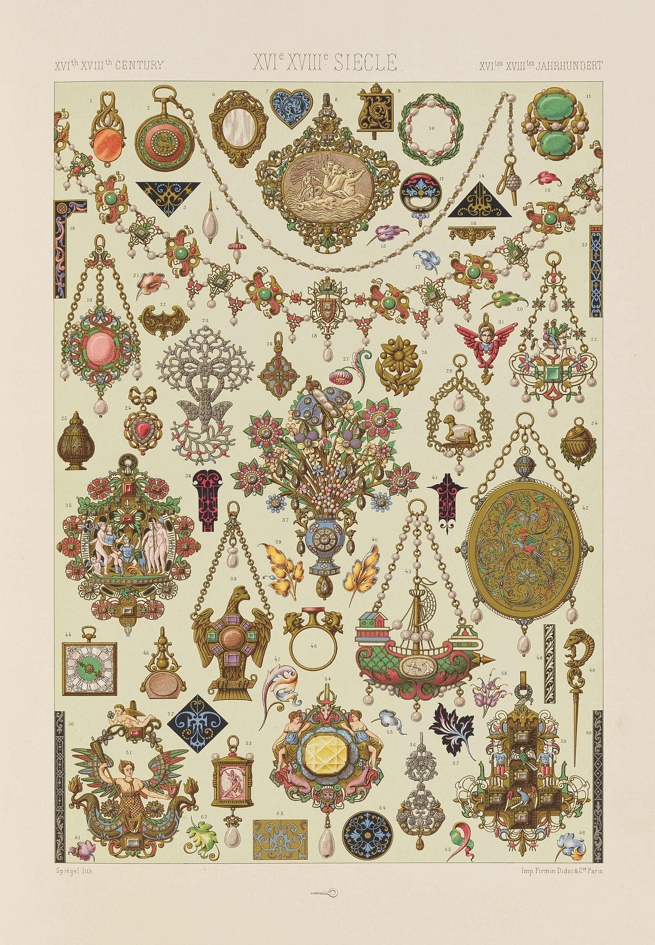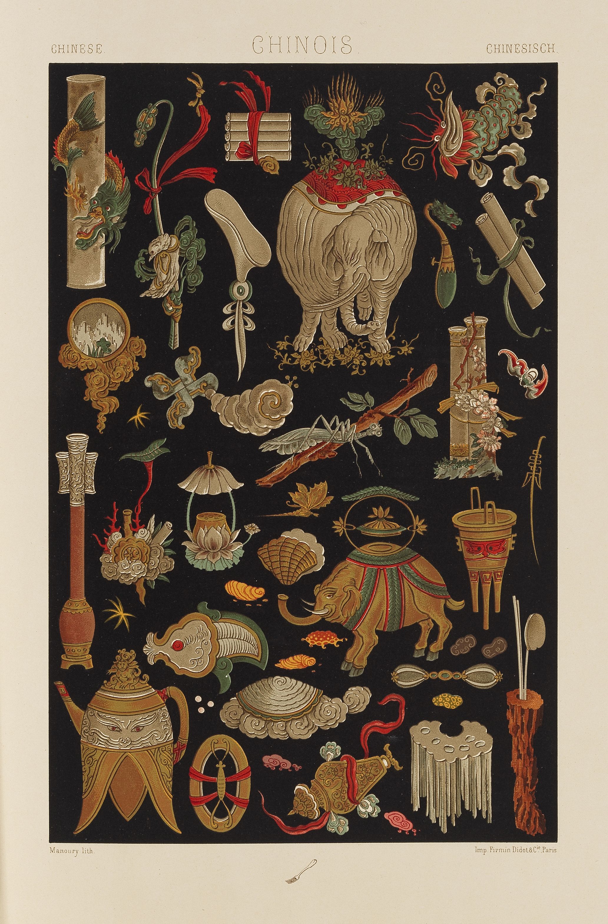 Paris, Firmin-Didot, 3ème édition, 1874, première série illustrée de 100 planches en chromolithographie. Deuxième série, deux volumes, illustrée de 120 planches chromolithographiées. Ensemble, trois volumes grand infolio, chagrin rouge orné, avec des différences d’ornementation des reliures. Bel exemplaire.