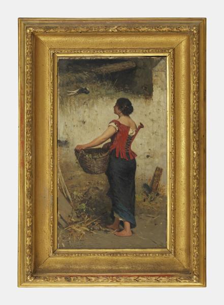 Paysanne au panier, huile sur panneau, signée, 48x26 cm