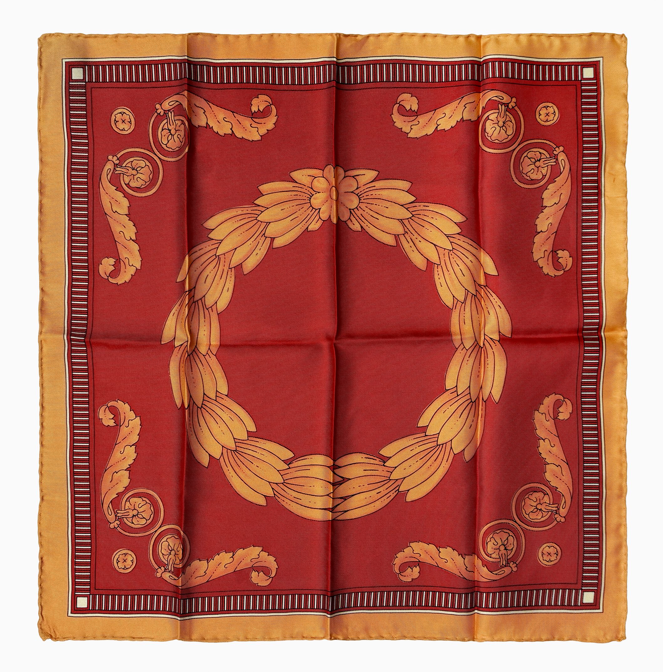 L'un carré à décor d'arnachement équestre sur fond bordeaux, l'autre carré à décor polychromes sur fond rose et jaune, chacun soie, 86x86 cmOn joint une pochette Versace à décor de couronne de laurier sur fond rouge, bordure orange, 40x40 cm.
