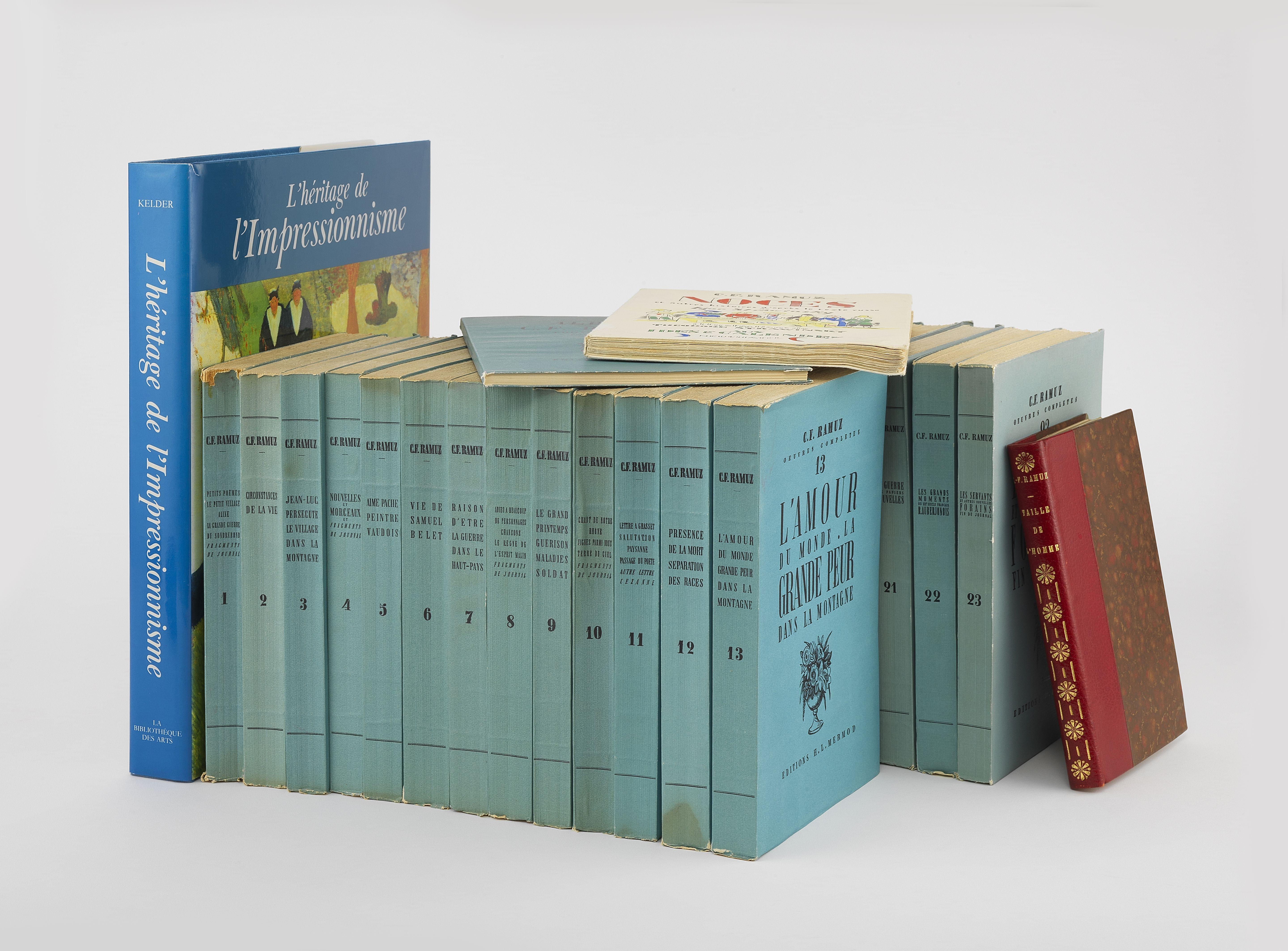 24 vol. in 8° brochés, couvertures bleues imprimées. Exemplaire num. sur vergé. Envoi de l’écrivain signé et daté. Joint : - RAMUZ : Taille de l’homme. Paris, Grasset, 1935 ; in 12, demi-mar. rouge orné, tête dorée, couvertures conservées. Bel envoi signé du poète, daté du 19 oct.(19)40. - RAMUZ - Théodore STRAWINSKY: Noces. Neuchâtel, Ides et Calendes, 1943 ; in 8° broché, couverture blanche illustrée rempliée. Ex. num. sur vélin.