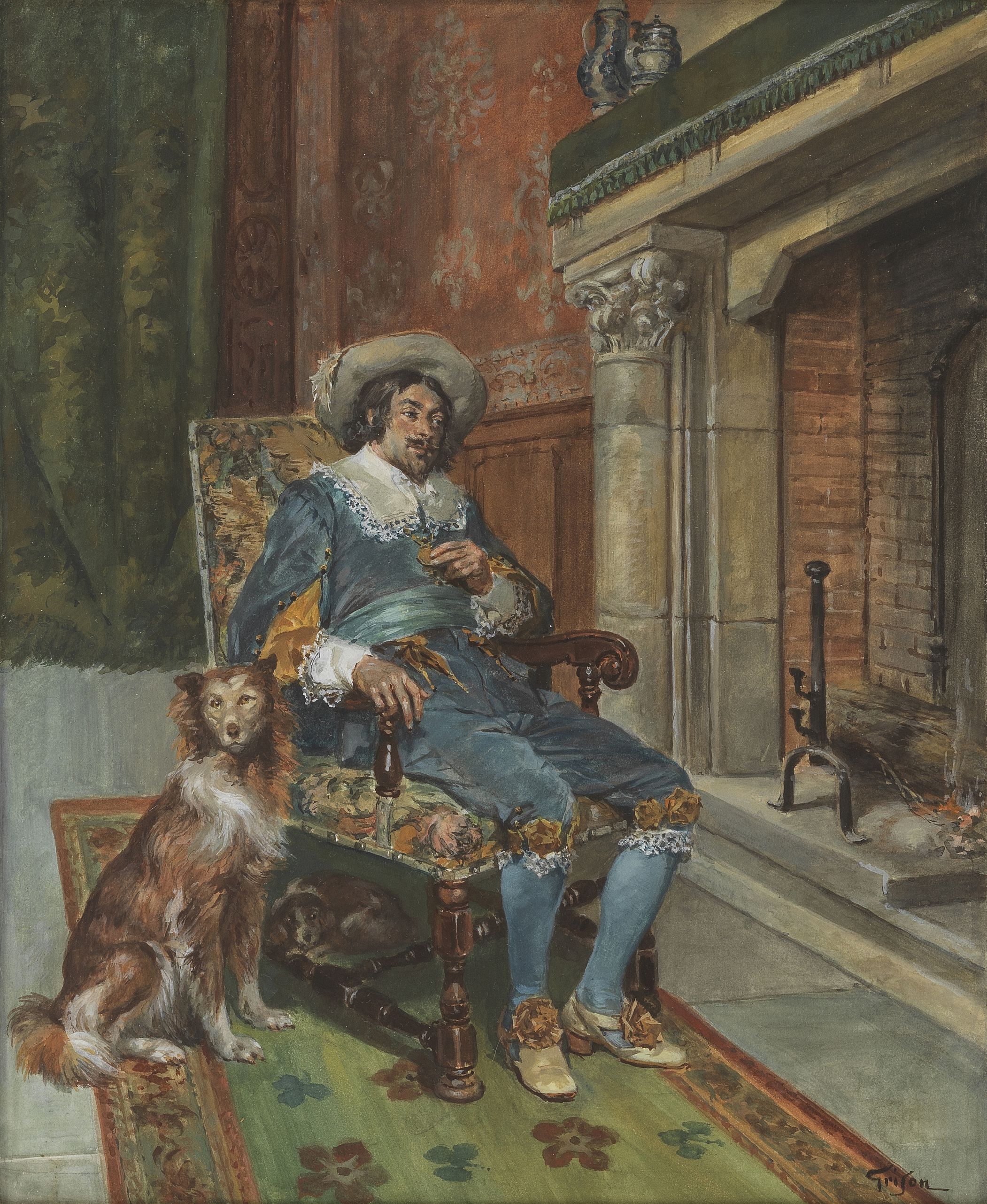 En attendant devant le foyer, gouache sur papier, signée, 30x26...