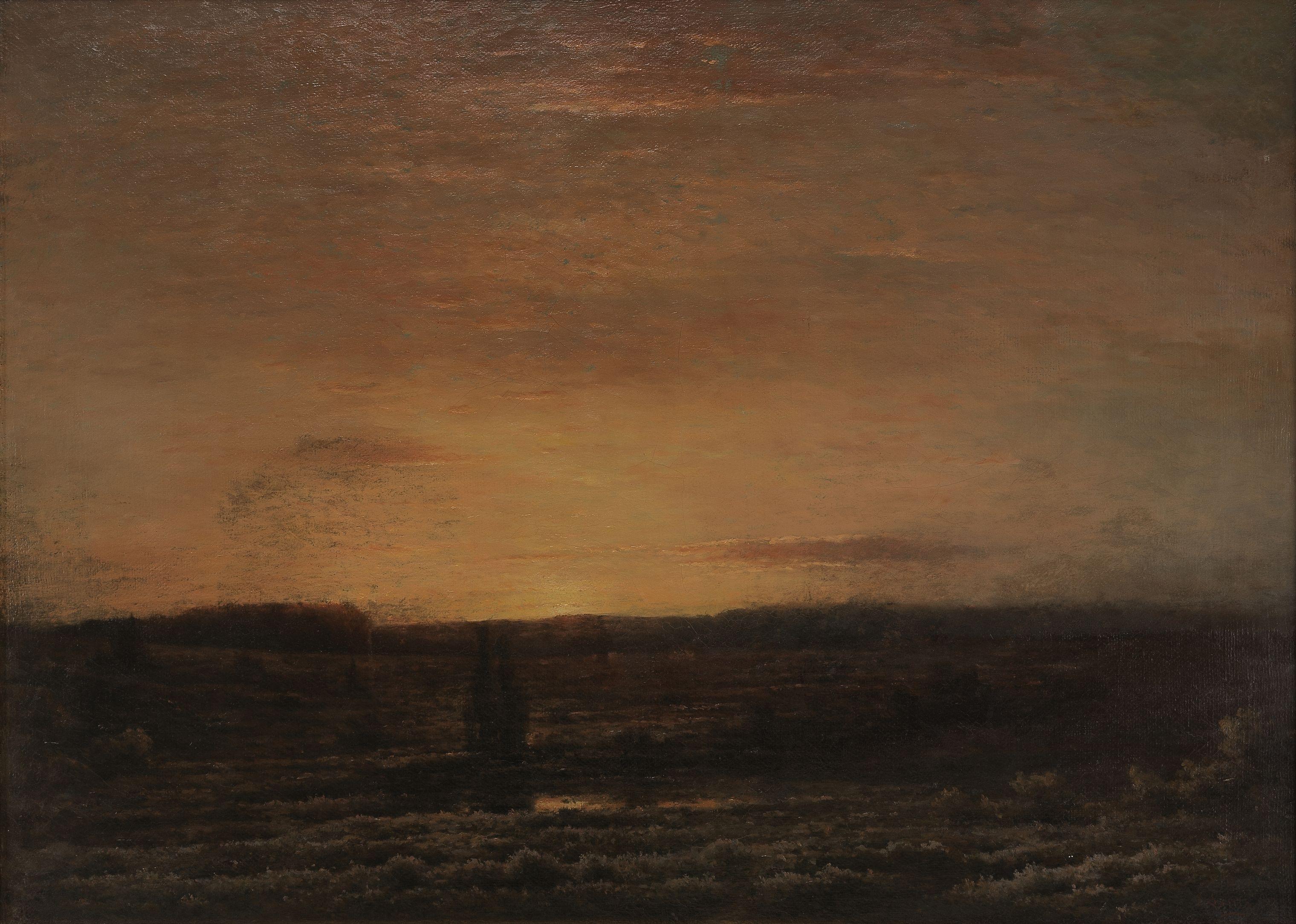 Paysage au coucher de soleil, huile sur toile, signée, 85x118 cm