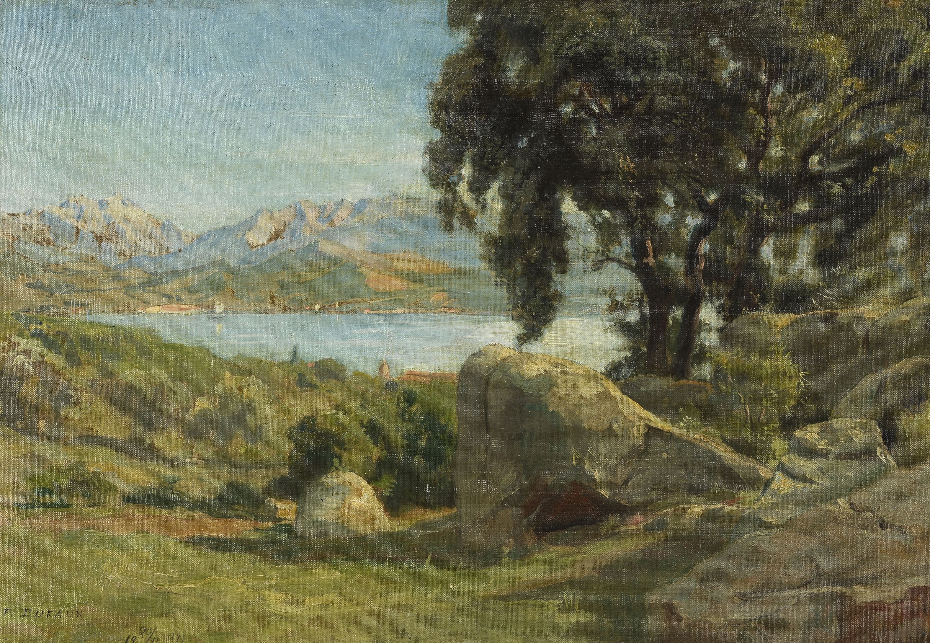 Paysage au bord du lac, huile sur toile marouflée sur carton, si...