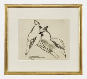 Deux jaseurs se faisant la cour, bois gravé, situé Confignon, daté 21 Février 1964, numéroté 369/600 et monogrammé, 13x16 cm