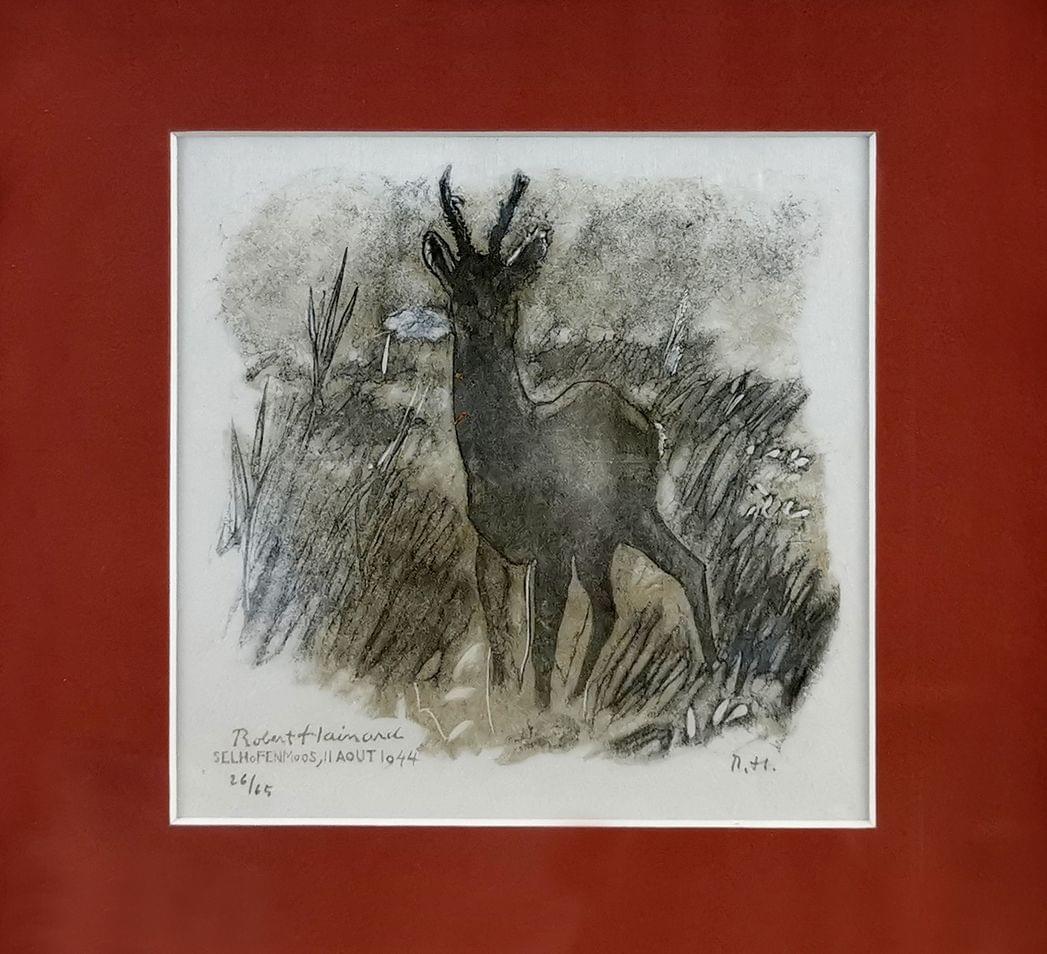 Broquant dans la brume, Selhofenmoos, 11 août 1944, bois gravé, monogramé et numéroté 26/65, 15x15 cm