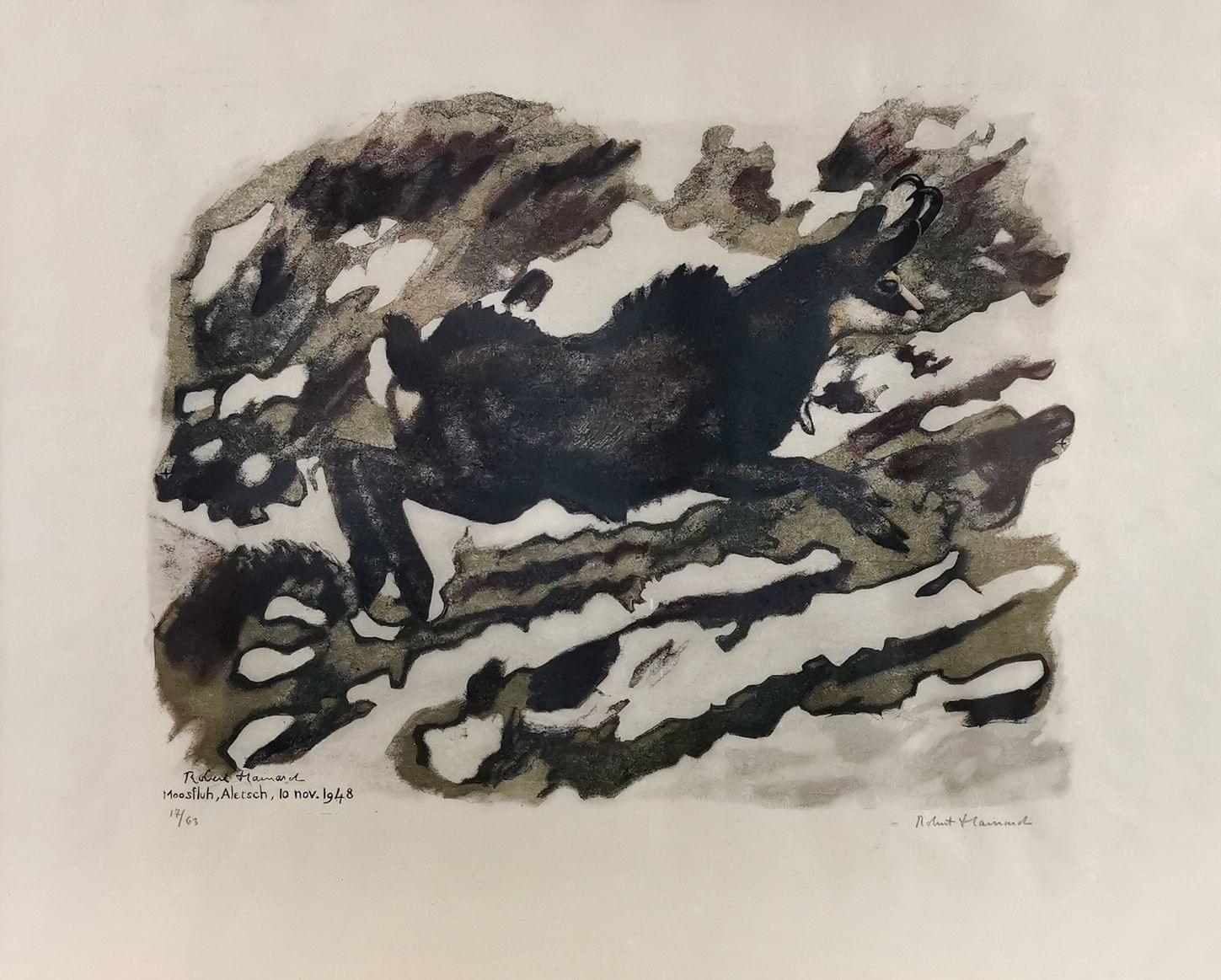 Chamois au galop, Moosfluh, Aletsch, 10 nov. 1948, bois gravé, signé et numéroté 17/63, 30x36 cm