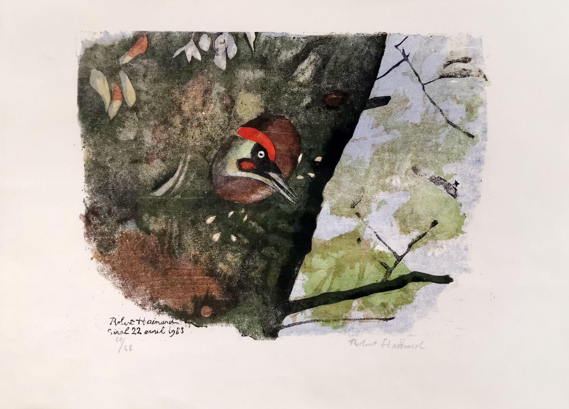 Oiseau sur branche, Soral, 22 avril 1983, bois gravé, signé et numéroté 64/88, 35x49 cm
