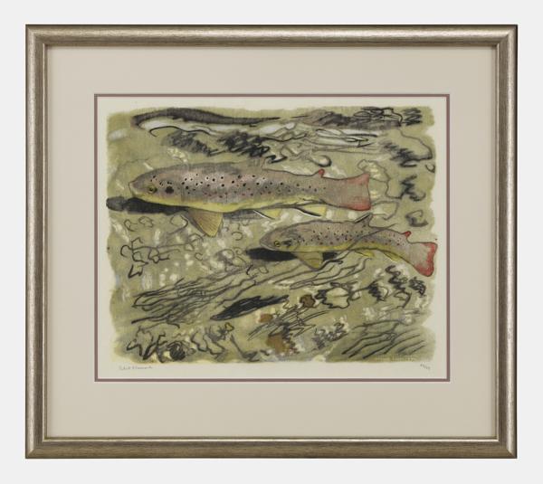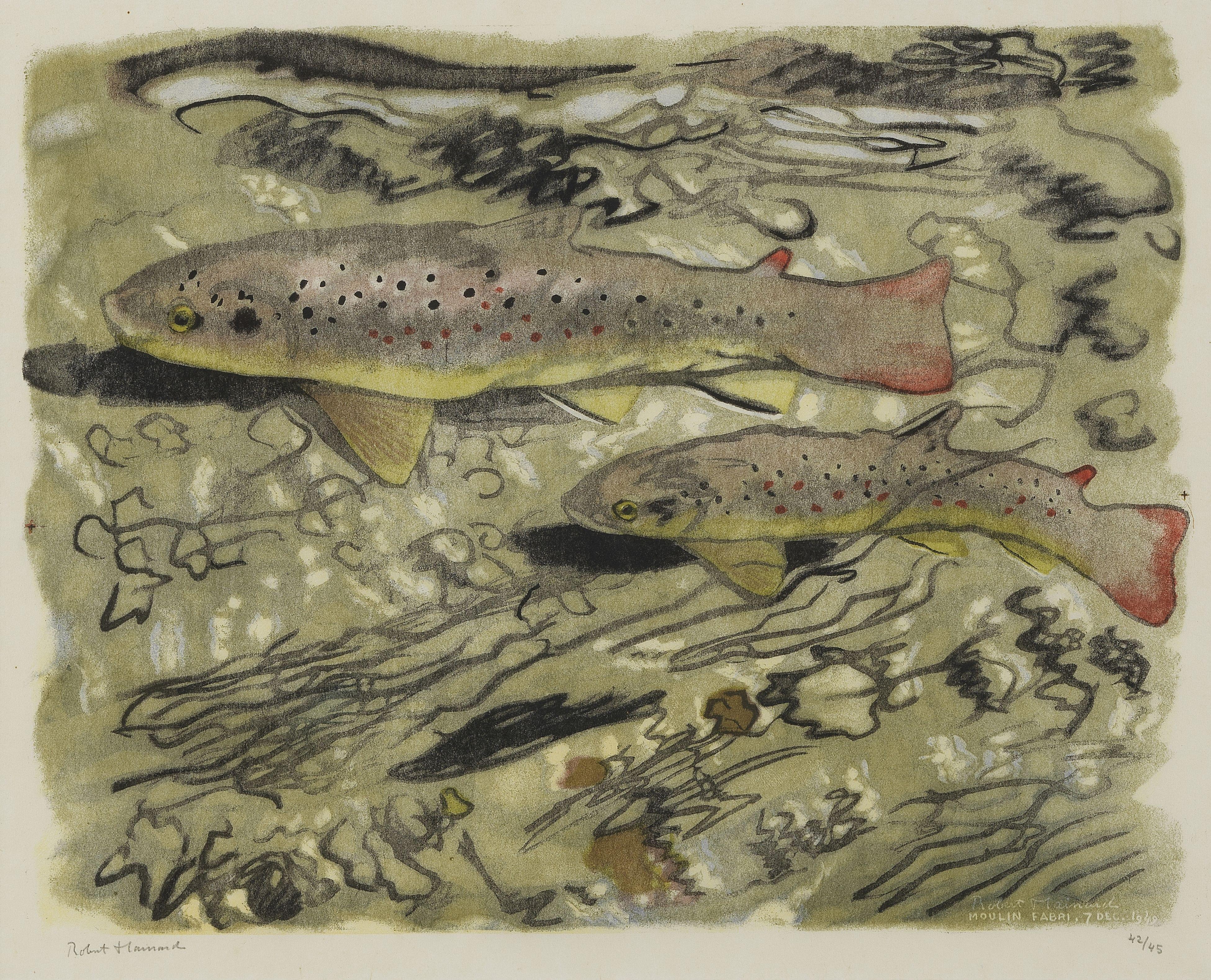 Truites frayant, Moulin Fabri, 7 dec 1949, bois gravé, signé et numéroté 42/45, 42x48,5 cm