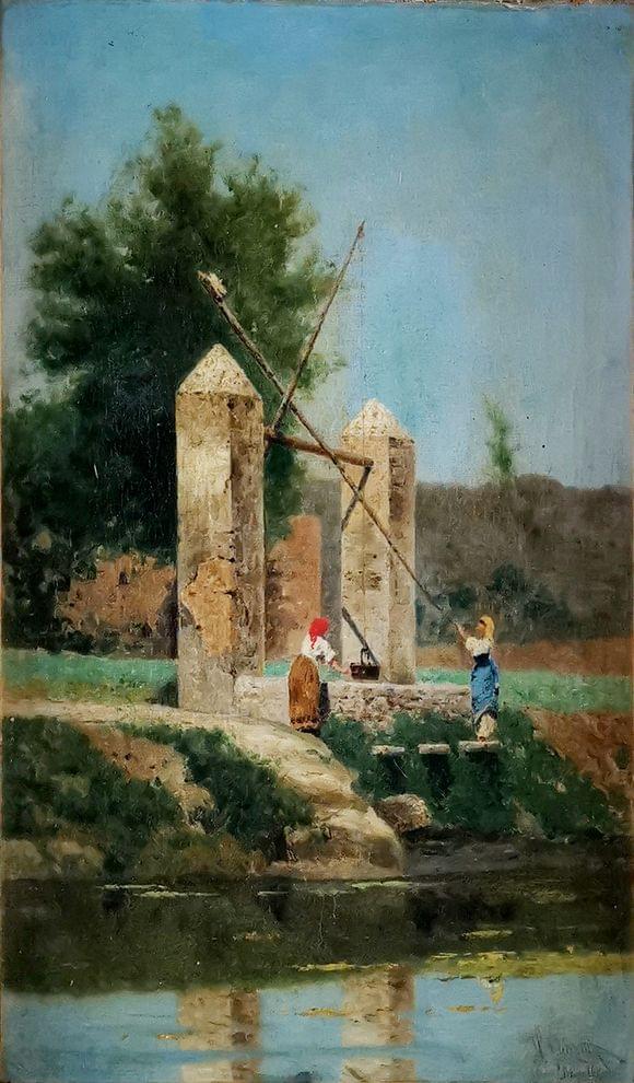 Femmes au puits, huile sur toile, signée et située Napoli, 52,5x30,5 cm