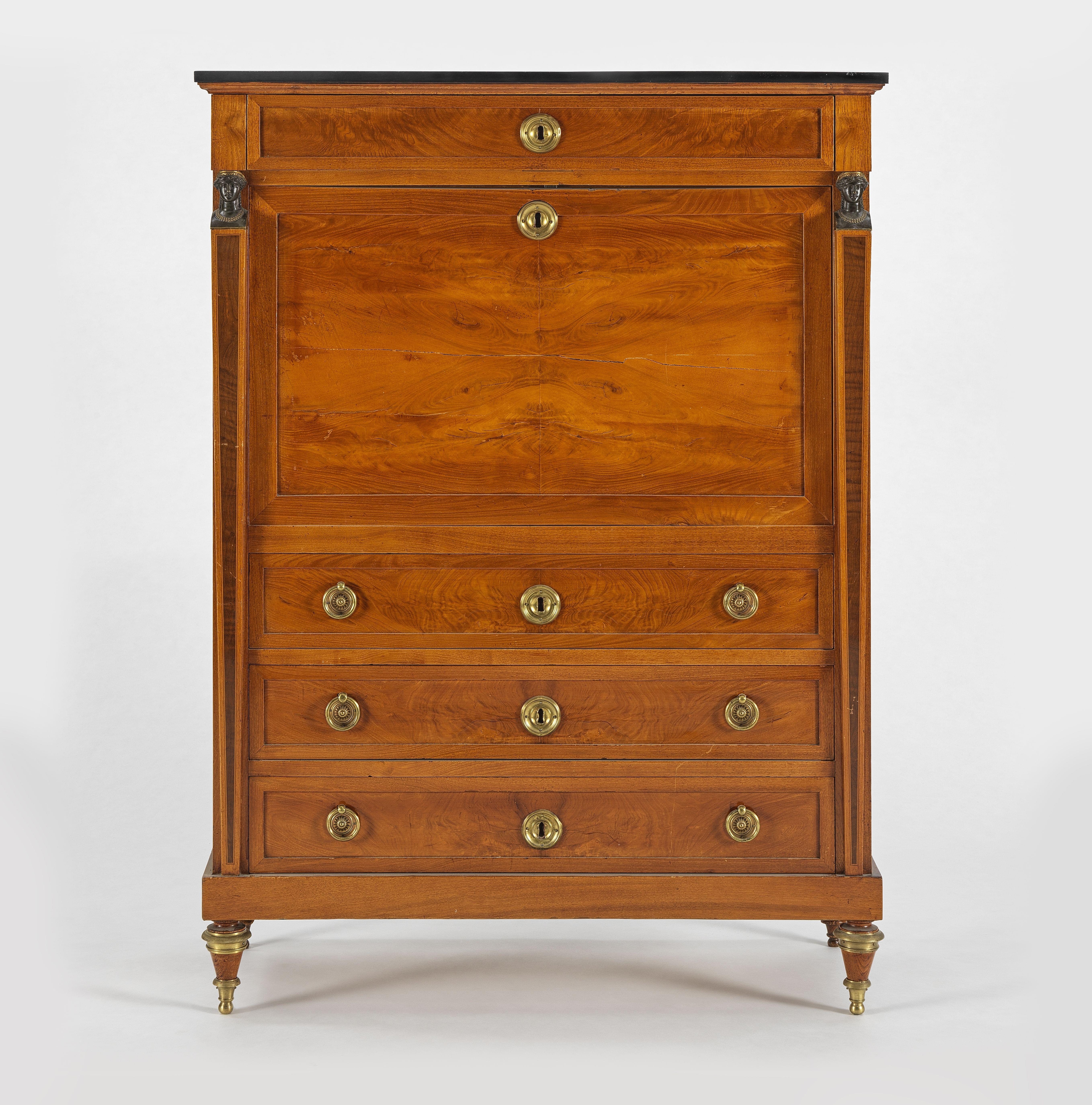 Quatre tiroirs et un abattant, montants à têtes à l'antique, acajou et bois noirci, bronze, 140x102x55 cm