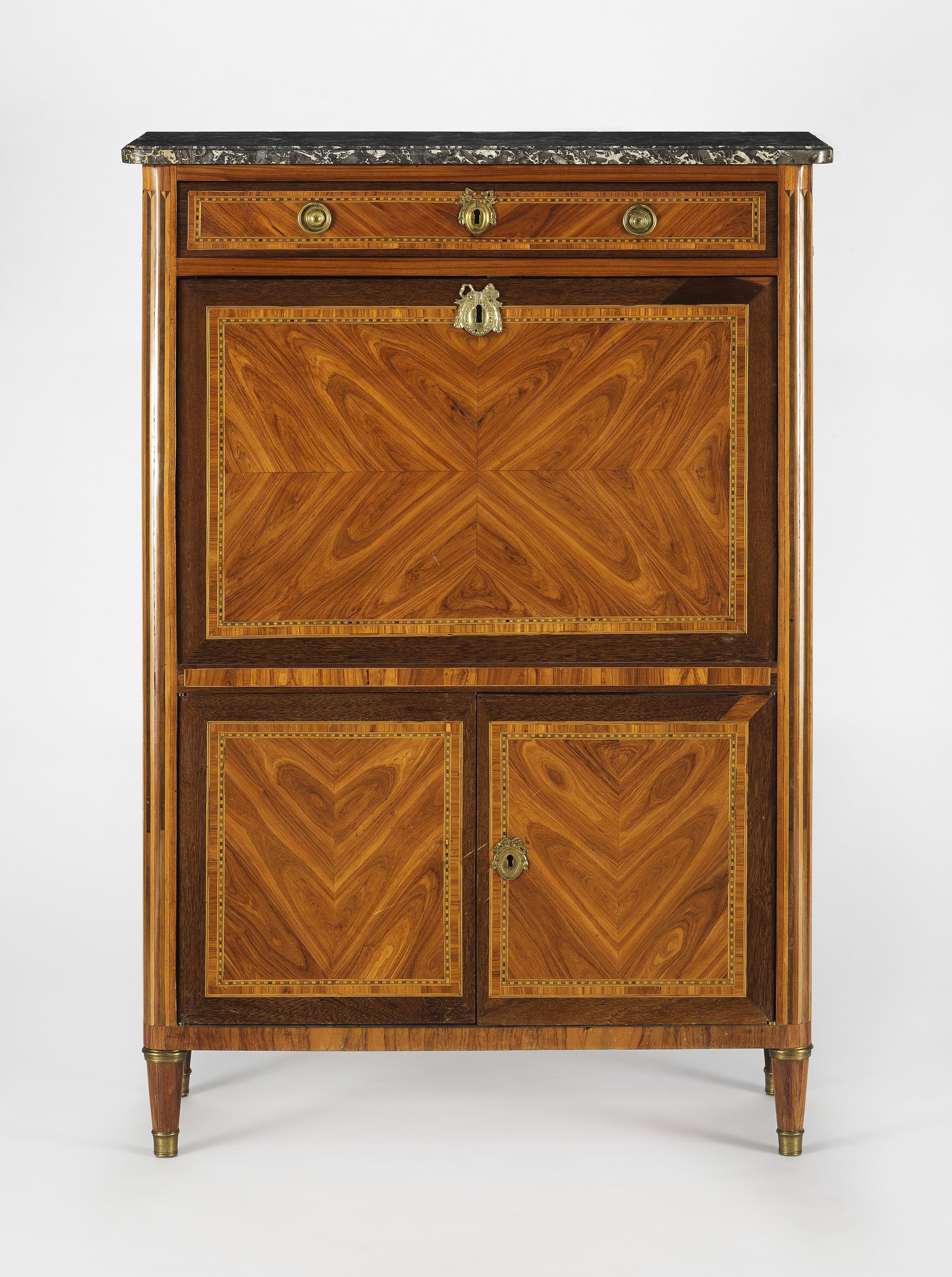 Un tiroir, un abattant et deux vantaux, bois de rose et bois de violette, marbre gris, 143x97x39 cm