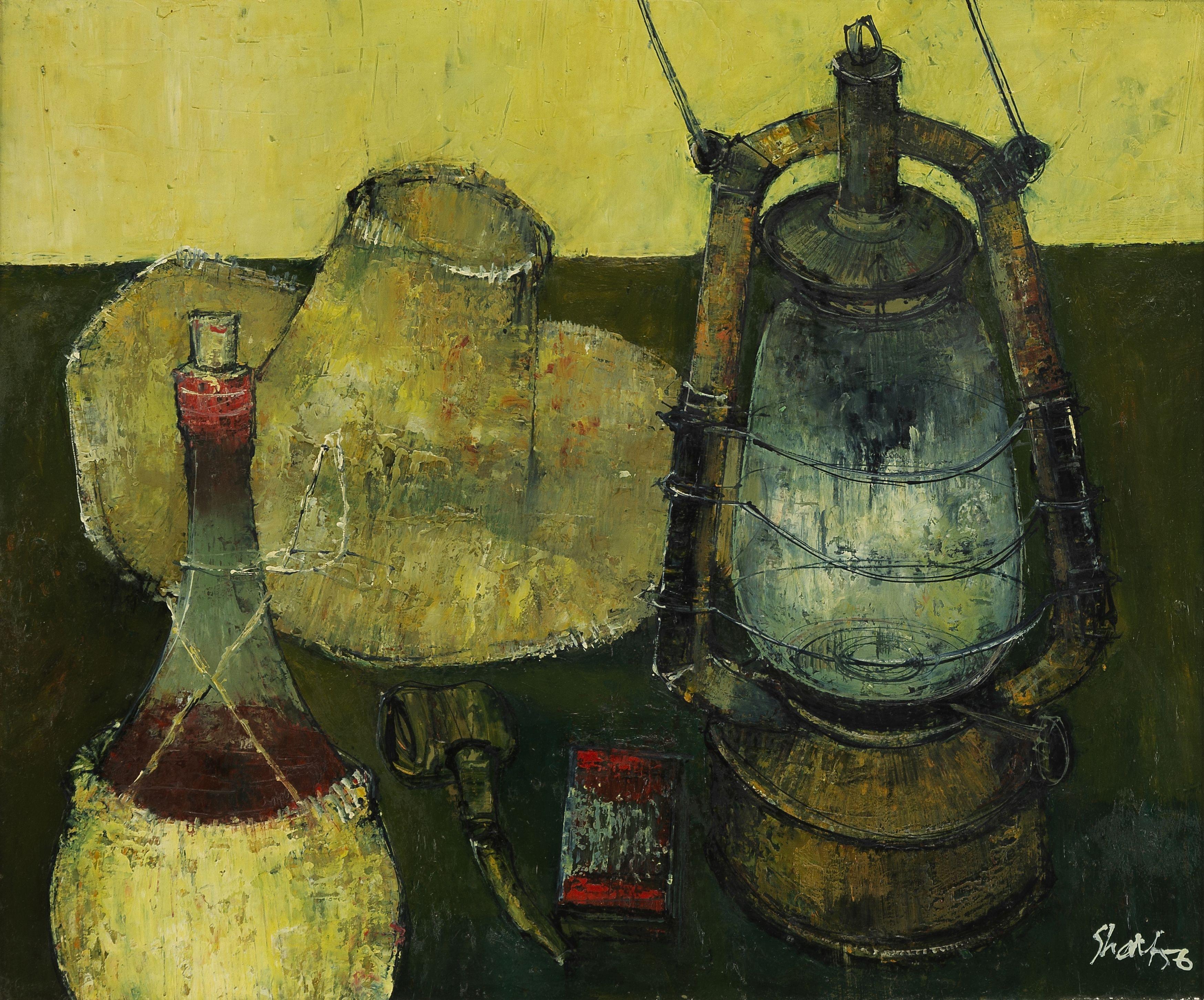 Nature morte à la lampe de tempête, huile sur toile, signée et datée 56, 46x55 cm
