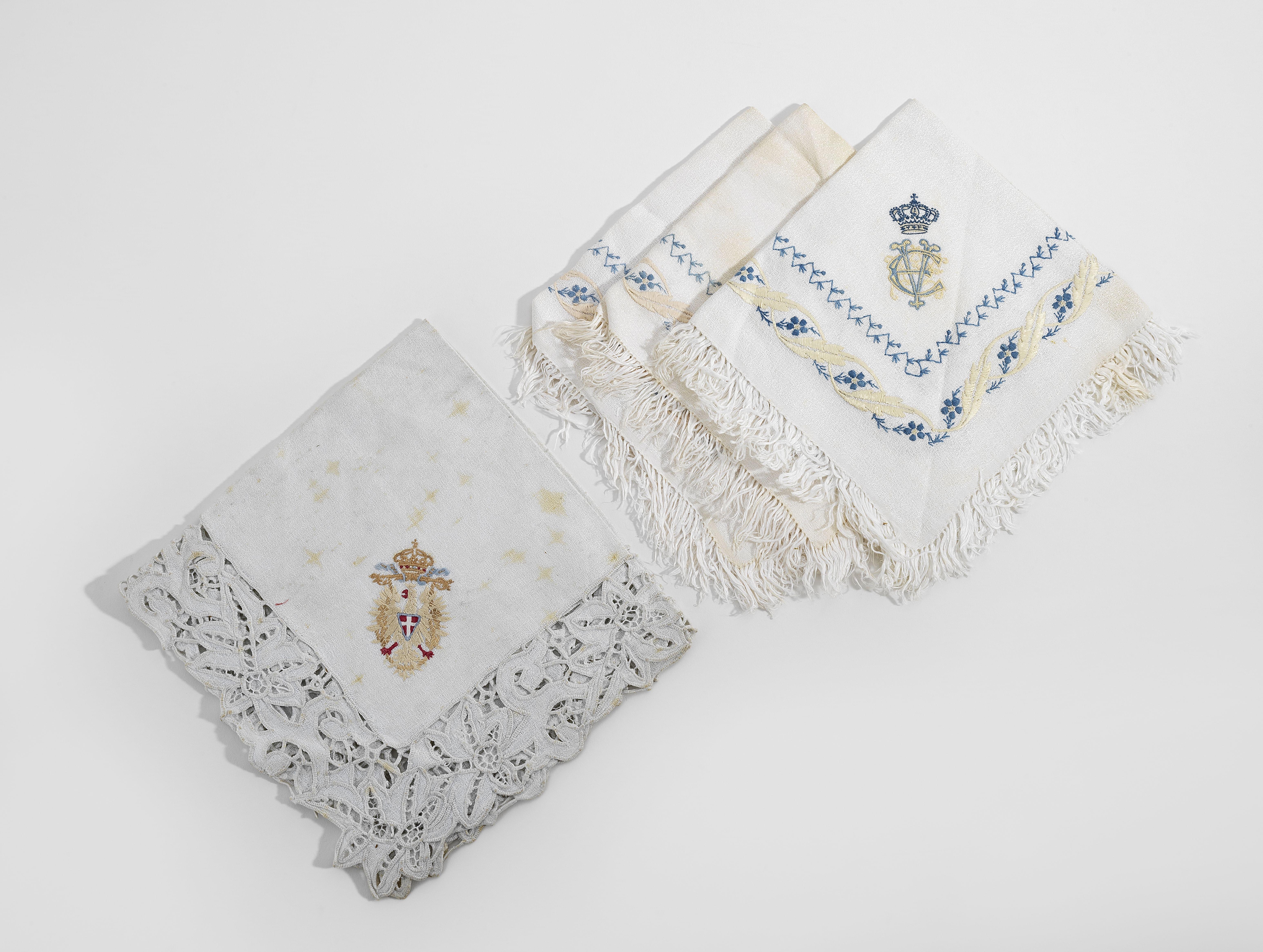 4115. Série de trois serviettes à décor brodé au chiffre de Victor-Emmanuel III de Savoie