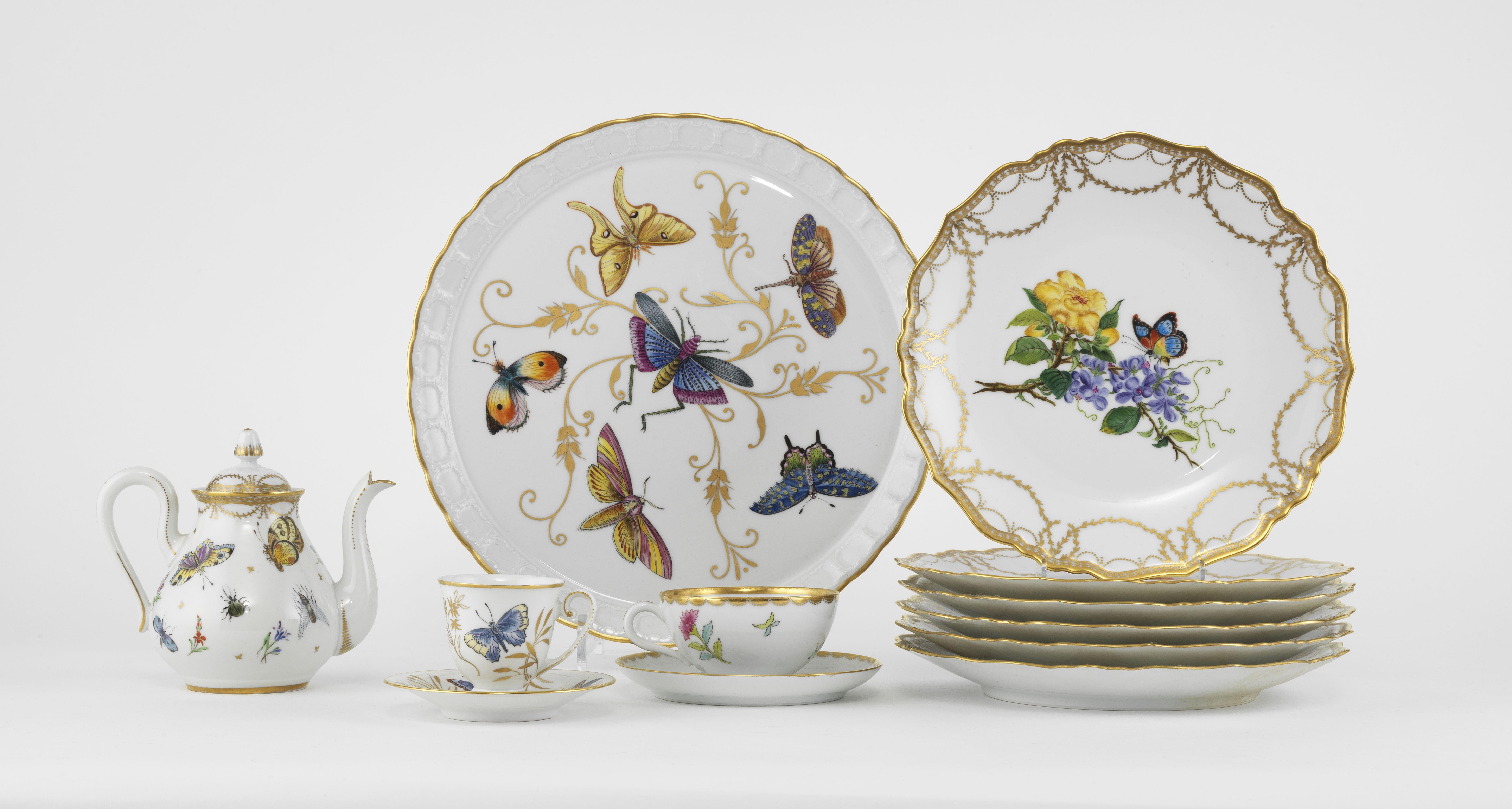 Décor peint à la main par Renée Rapin dans le style du XVIIIe s, porcelaine, comprenant: 6 assiettes, 1 coupe centre de table, 3 plats, 1 théière et 1 tasse (12p)