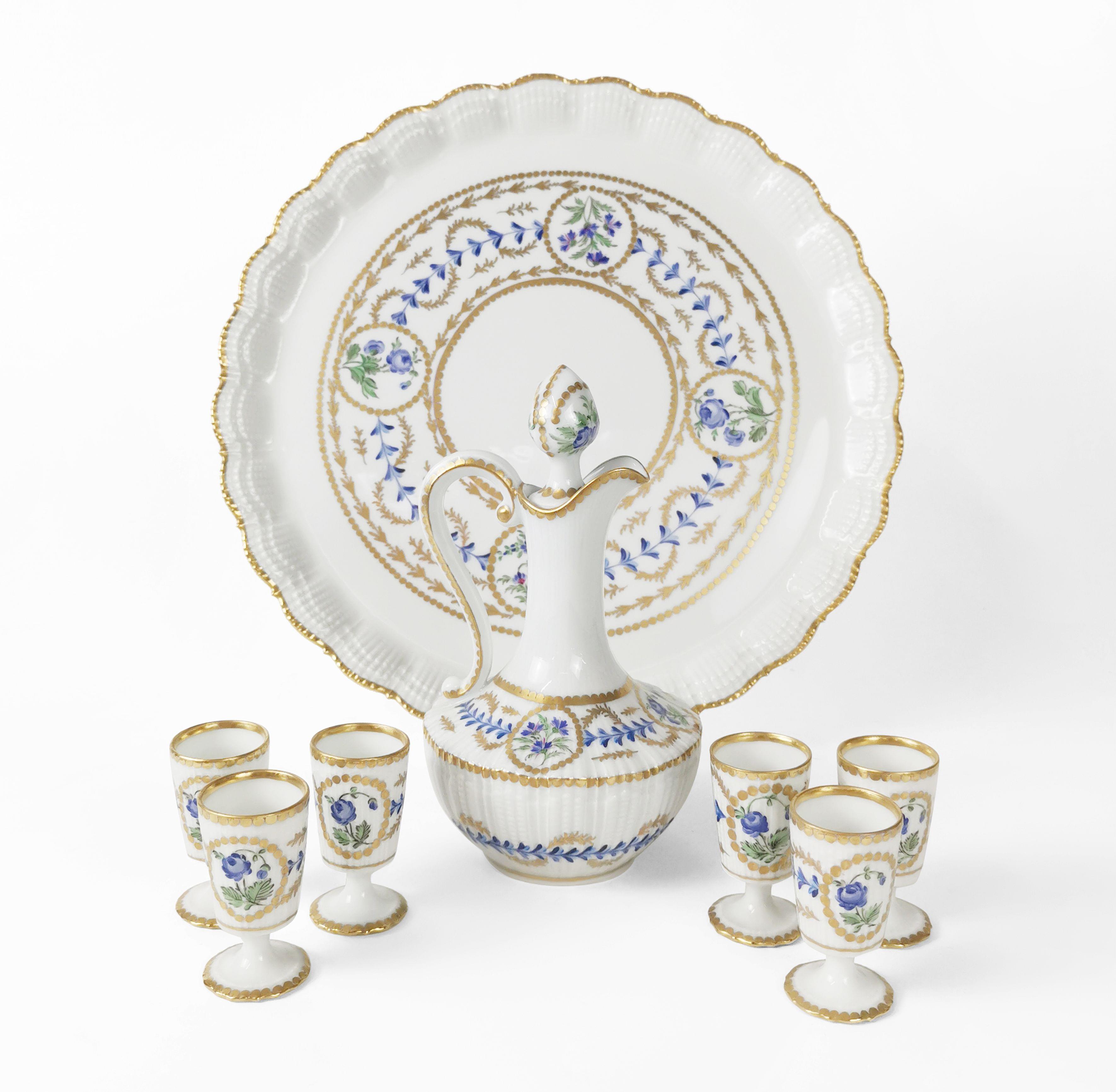 3961. Service à liqueur à décor bleu et or de médaillons fleuris