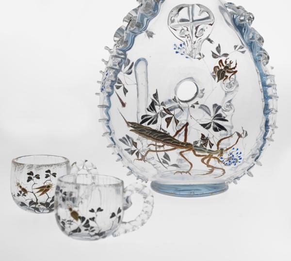 Verre translucide à décor émaillé de fleurs et insectes en polychromie, H carafe 21 cm