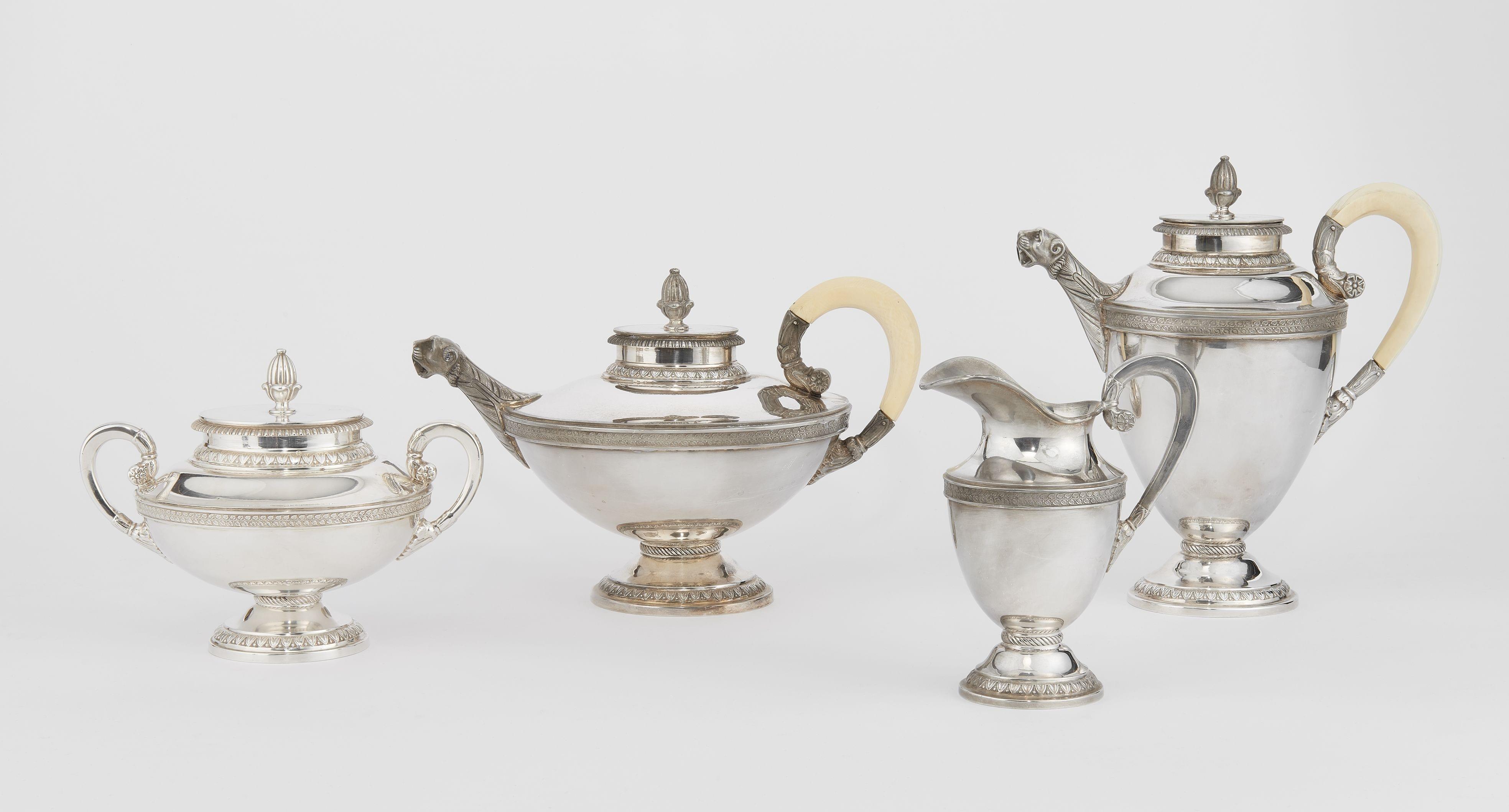 4705. Service à thé et café néoclassique à bec verseur tête de léopard, frises de lierre et feuilles d'eau