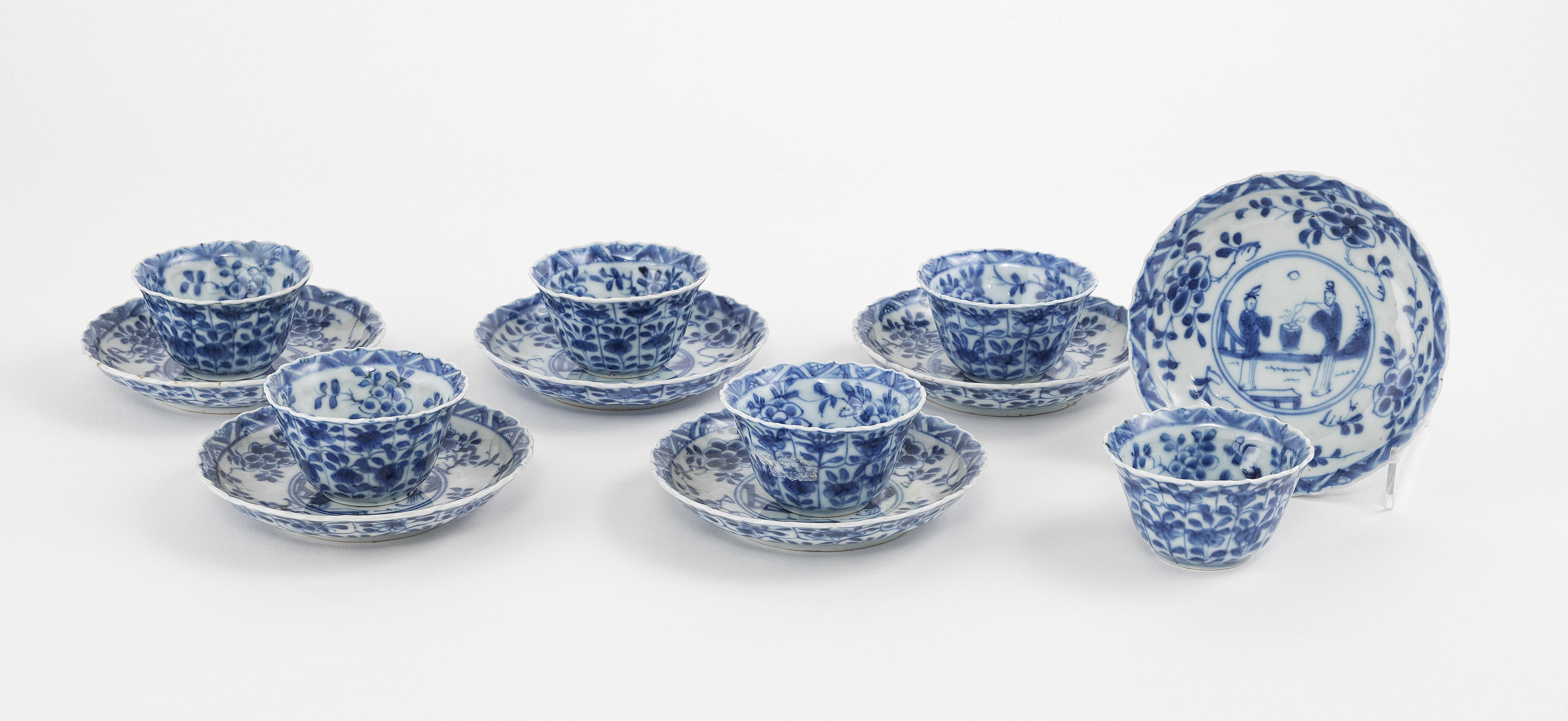 144. Important bol à punch sur présentoir, ses six tasses et son kovs...