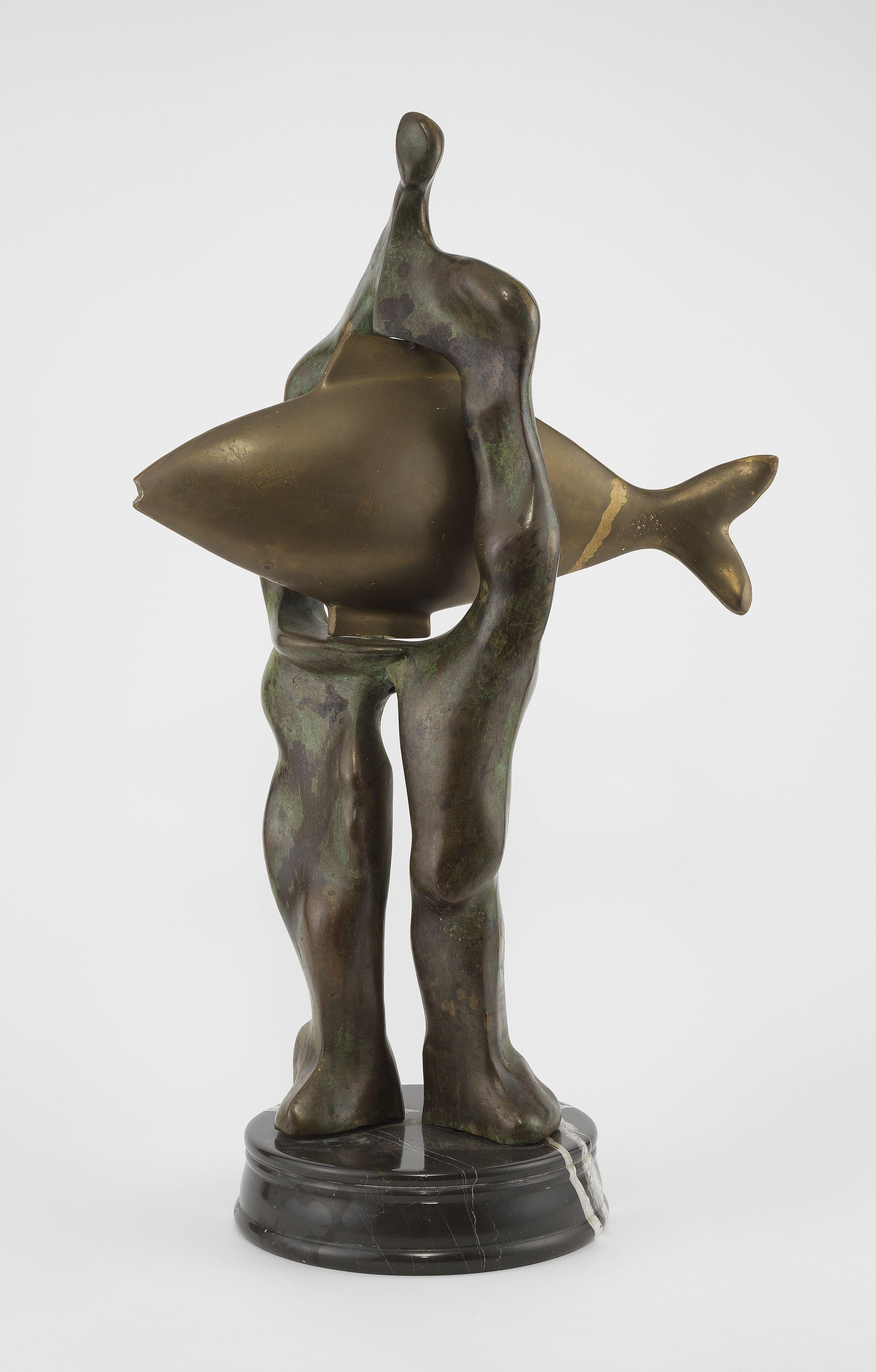 Silhouette au poisson, bronze à patine foncée et marbre, monogrammé et daté 89, H 74 cm