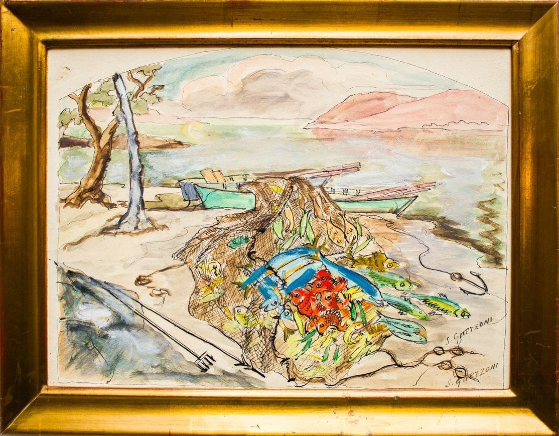 Filet de pêche, encre et gouache sur toile, 24 x 33 cm