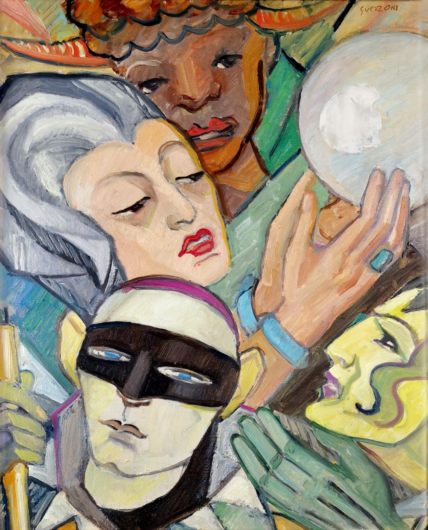 Etude de masques, huile sur pavatex, signée, 60x50 cm