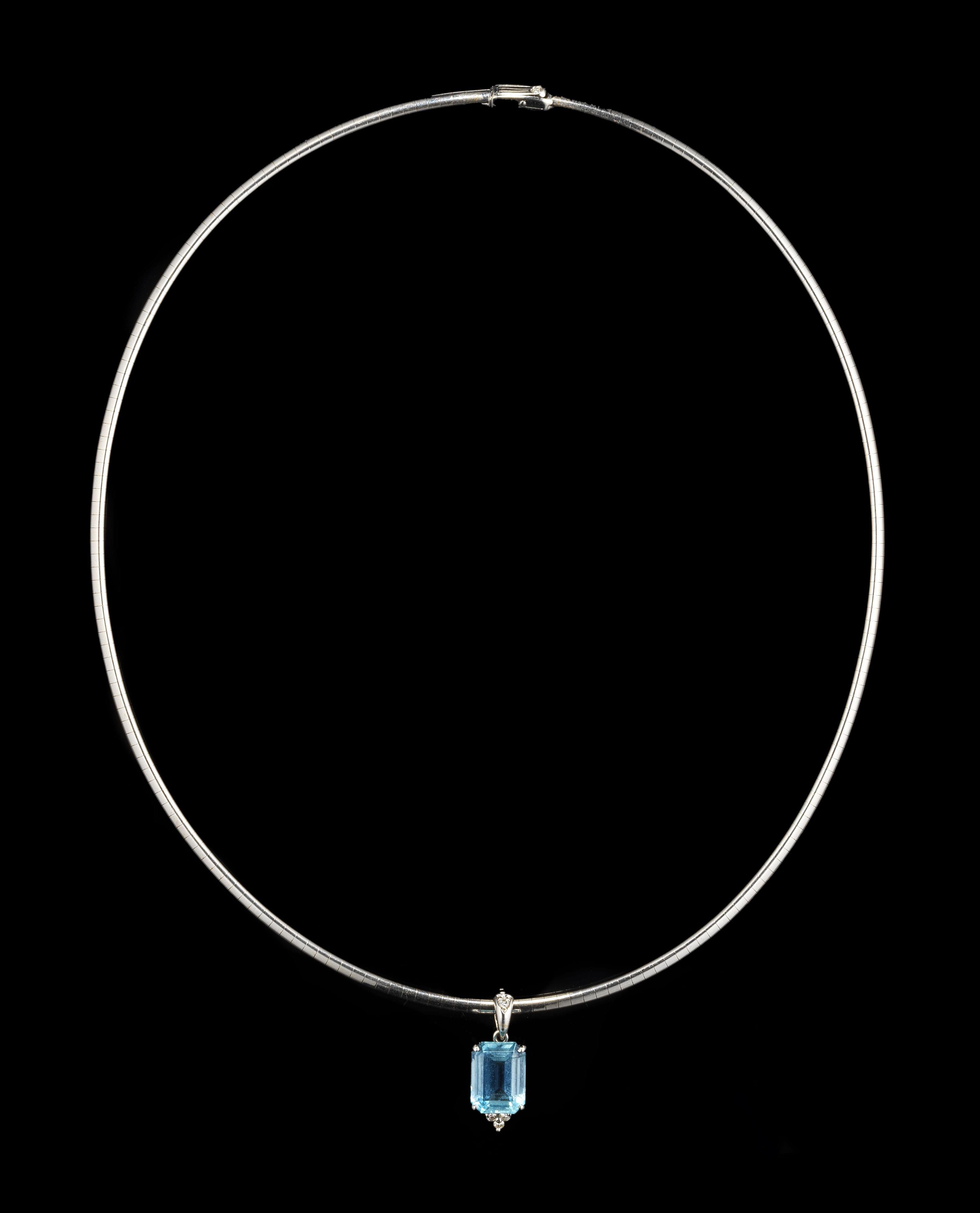 317. Stern, collier tour de cou retenant une aigue-marine taille émeraude (env. 3 ct) rehaussée de diamants
