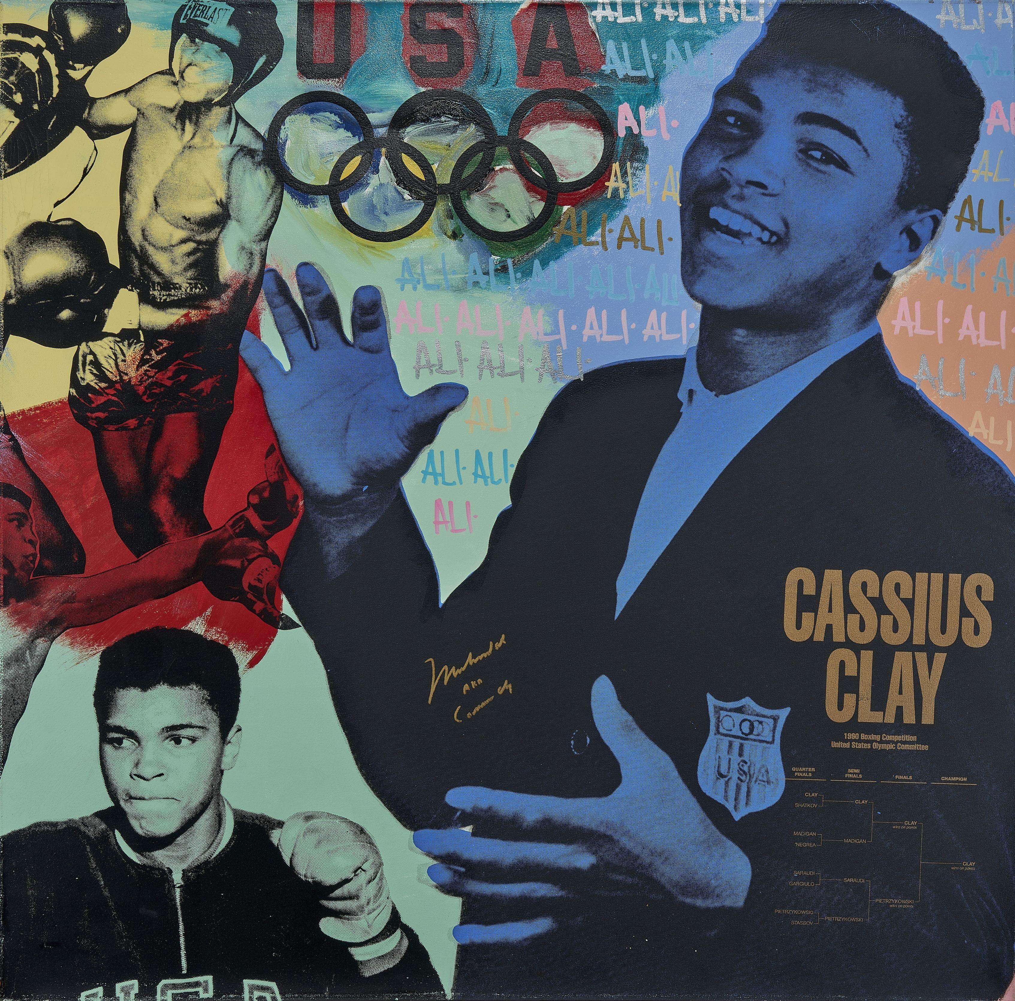 Muhammad Ali, sérigraphie et huile sur toile, signée et datée 1995, numérotée 12/100, 96x96 cm
