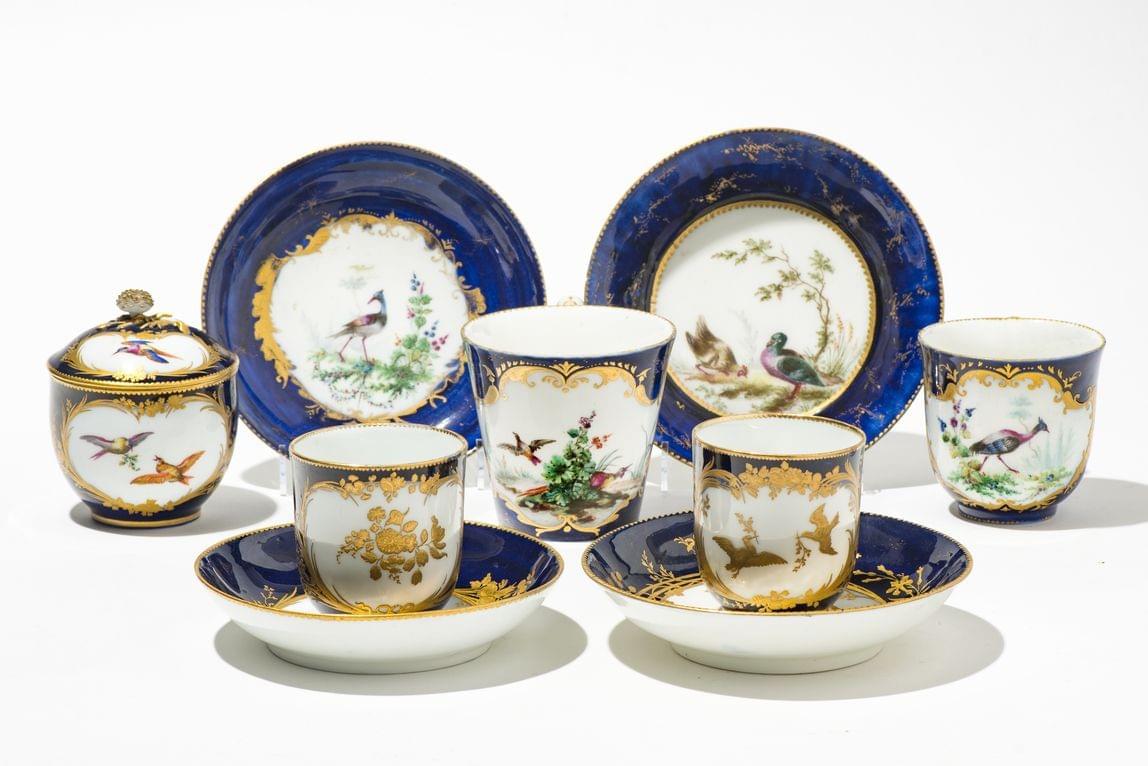 Bois laqué gris, cuir bleu (deux modèles différents: 6+2)
