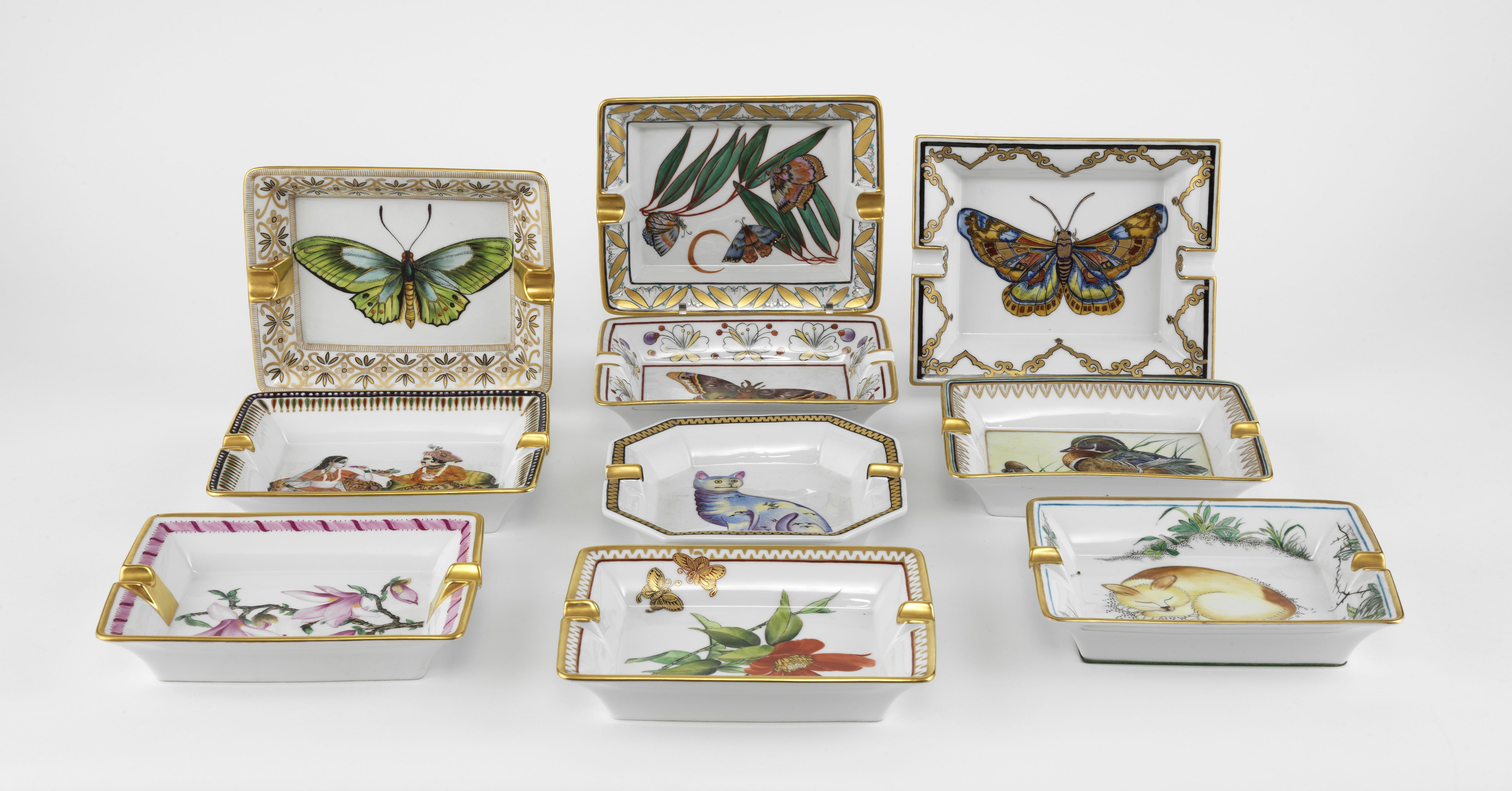 3984. Suite de 9 cendriers rectangulaires à décor de fleurs, animaux et couple indien