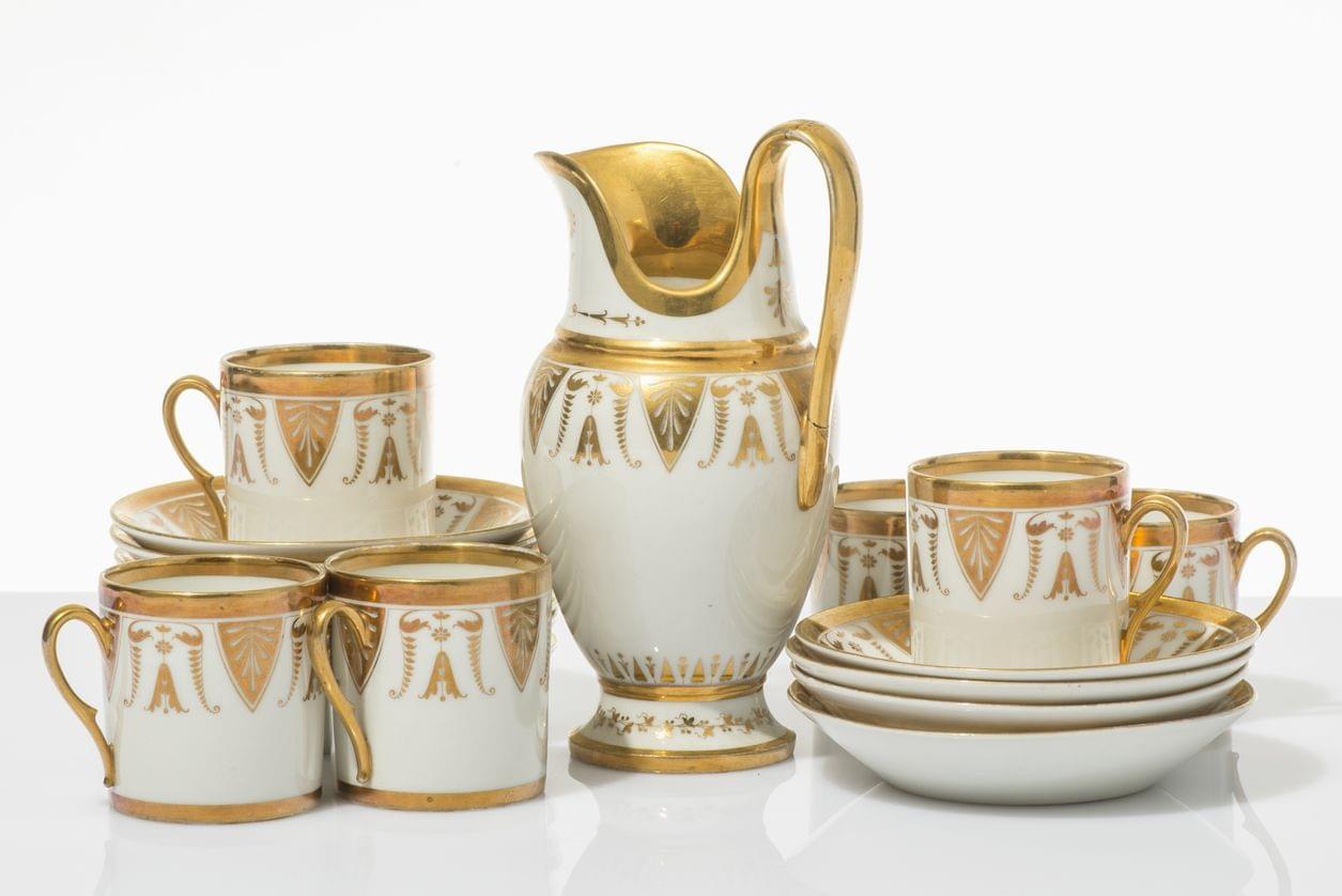 3178. Suite de six tasses litron d'époque Empire à décor blanc et or de palmettes