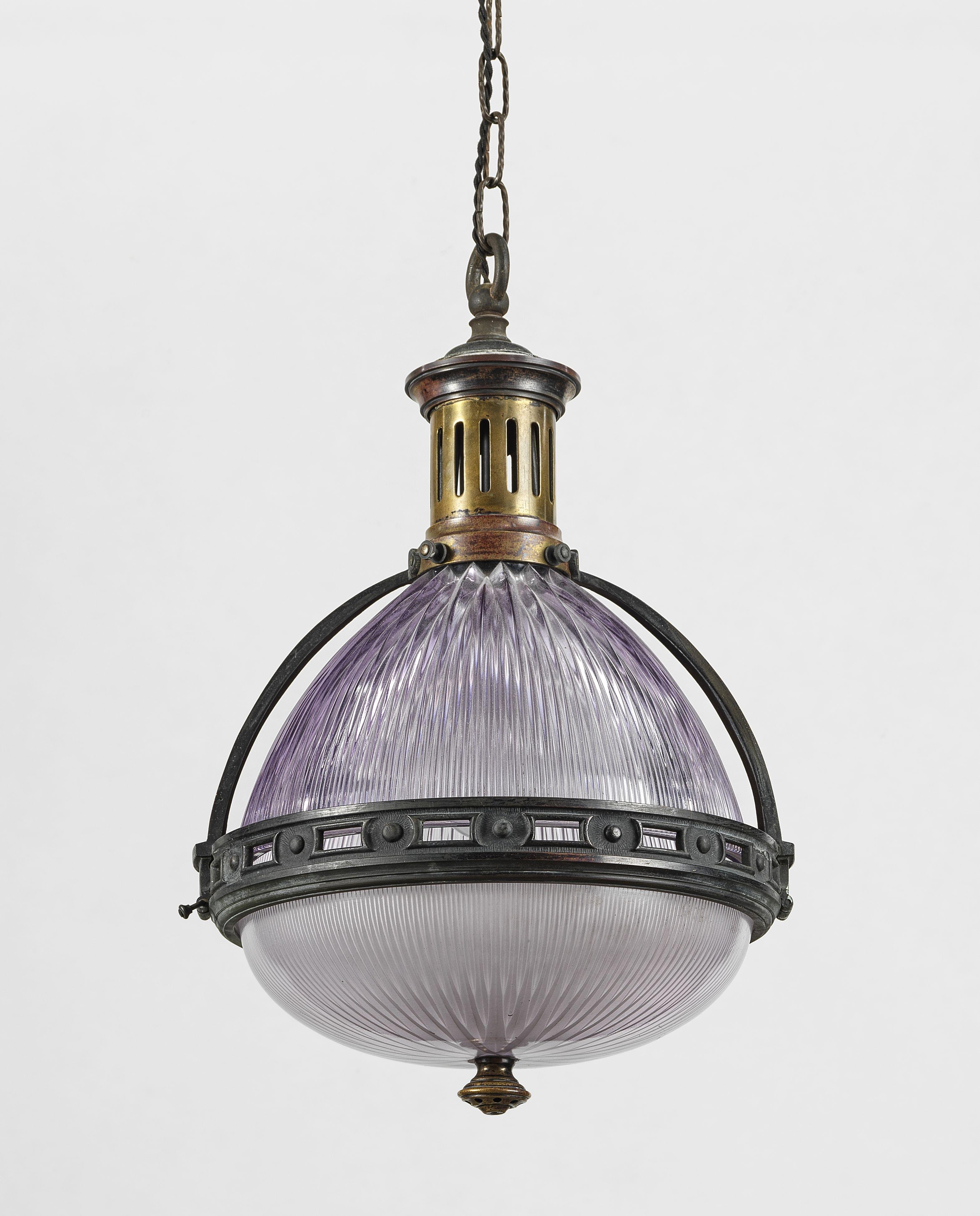 Bronze martelé, fer forgé et opaline rouge, H 163 et D 67 cm. Pr...