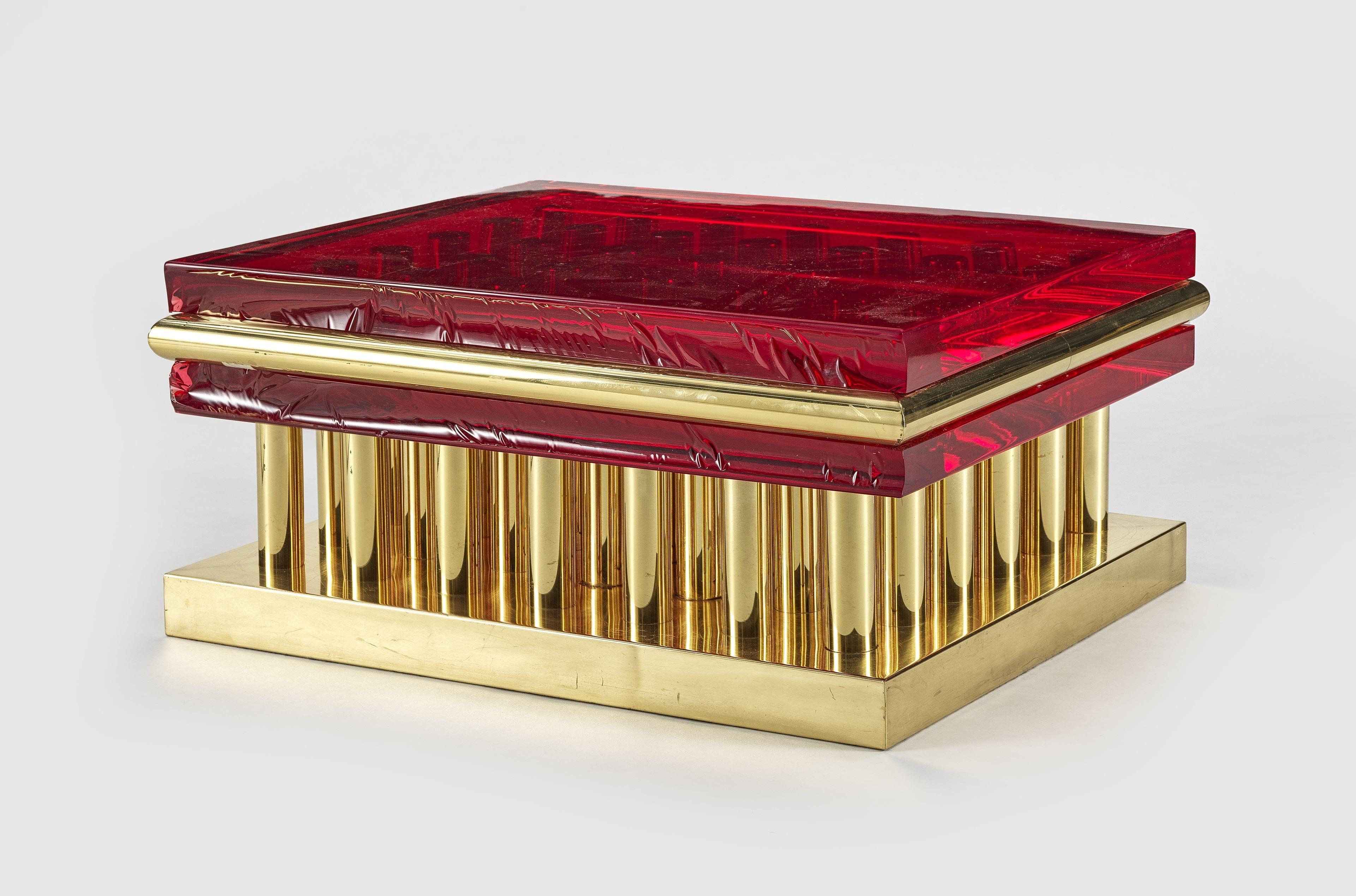 Un tiroir en ceinture, amarante et filet de bois clair, cuir dor...