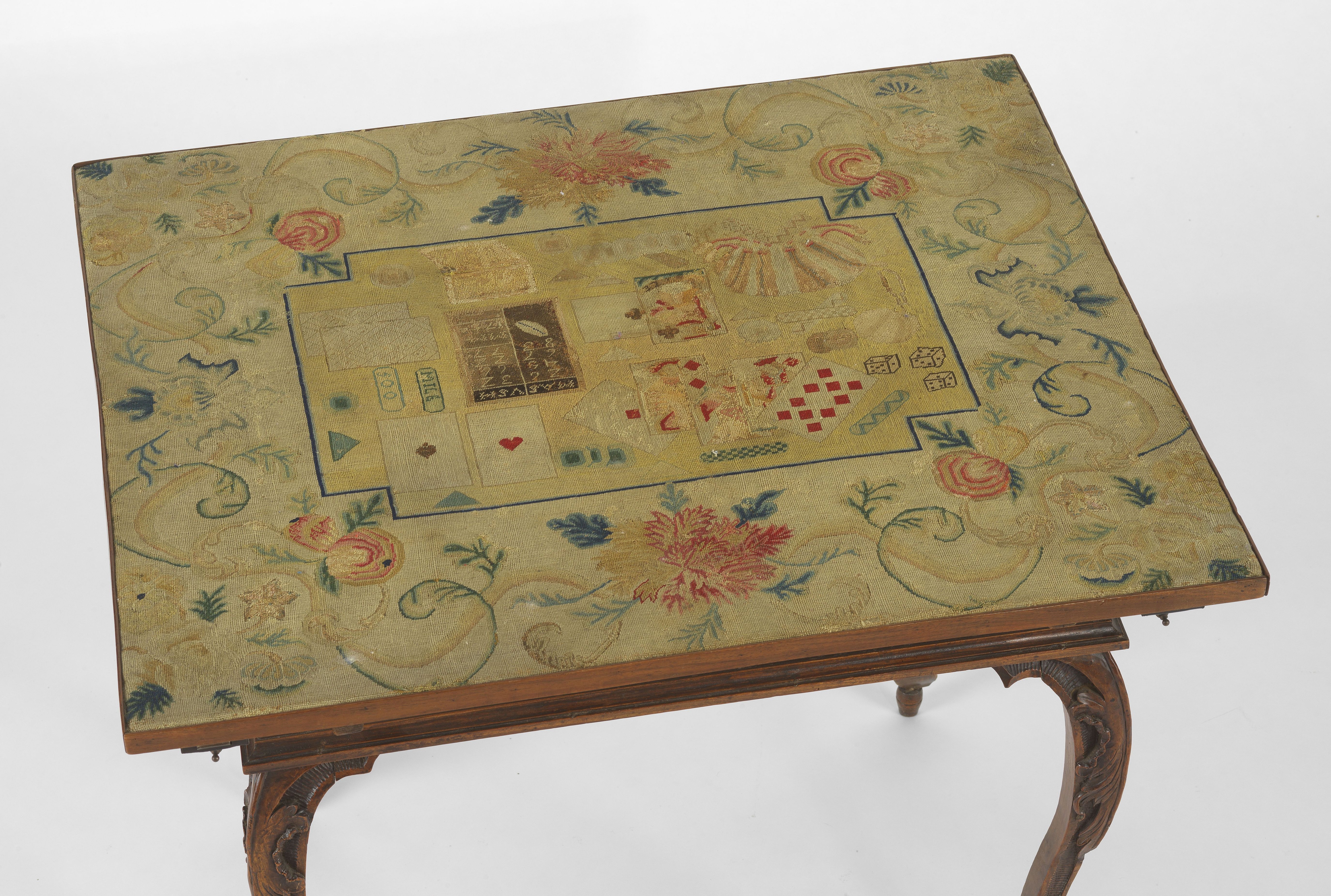 Plateau gainé d'une tapisserie aux petits points à décor en trompe l'œil d'une scène de jeu de carte, 73x85x73 cm. Provenance: Les Stern, une famille de collectionneurs.