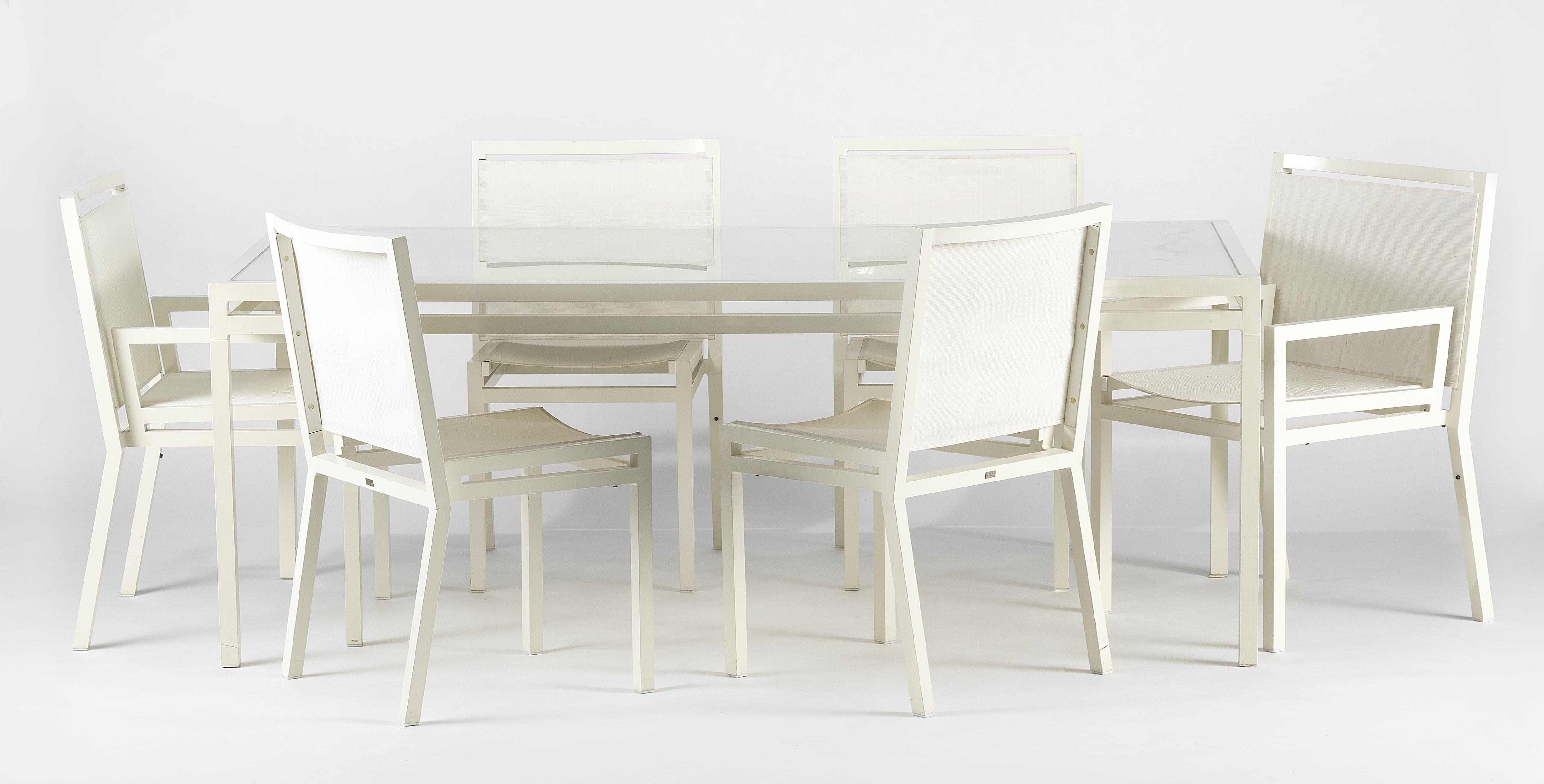 Tissu vert d’eau, piètement aluminium, étiquette de l’éditeur Fr...