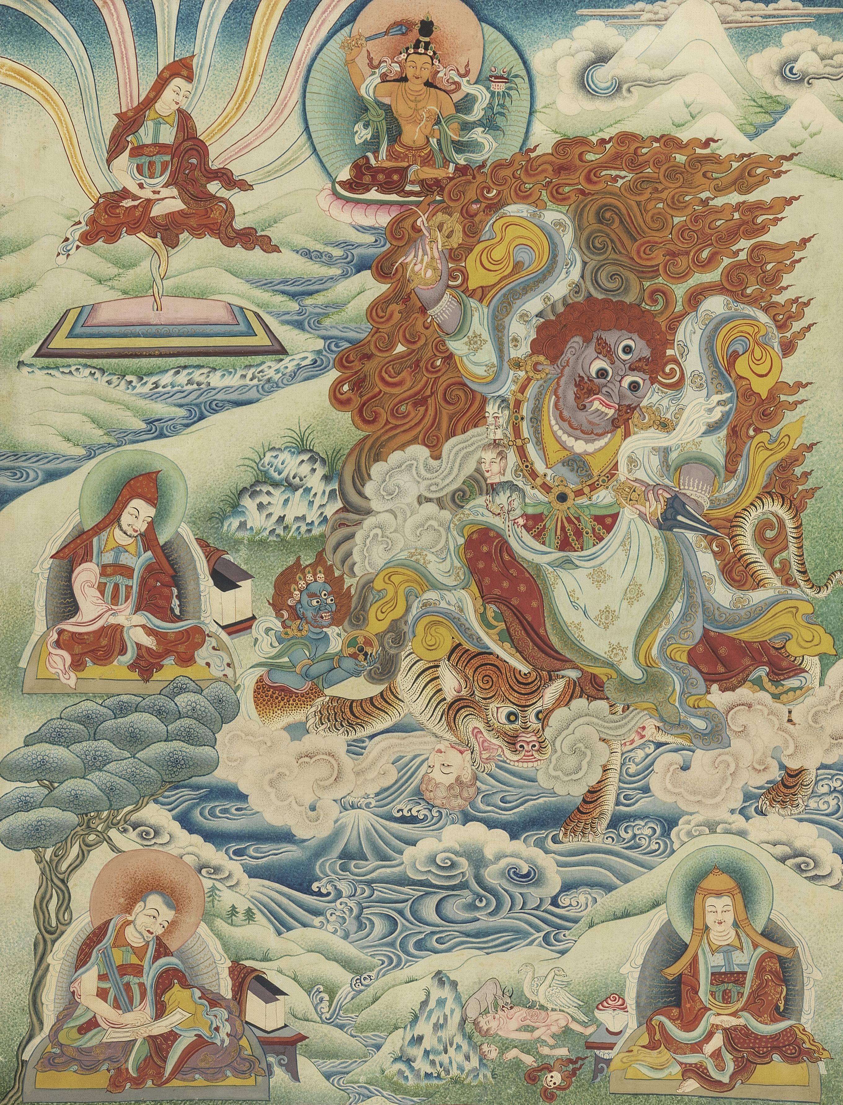 Figurant une divinité sur un tigre et ses acolytes, pigments sur toile, 50x37 cm