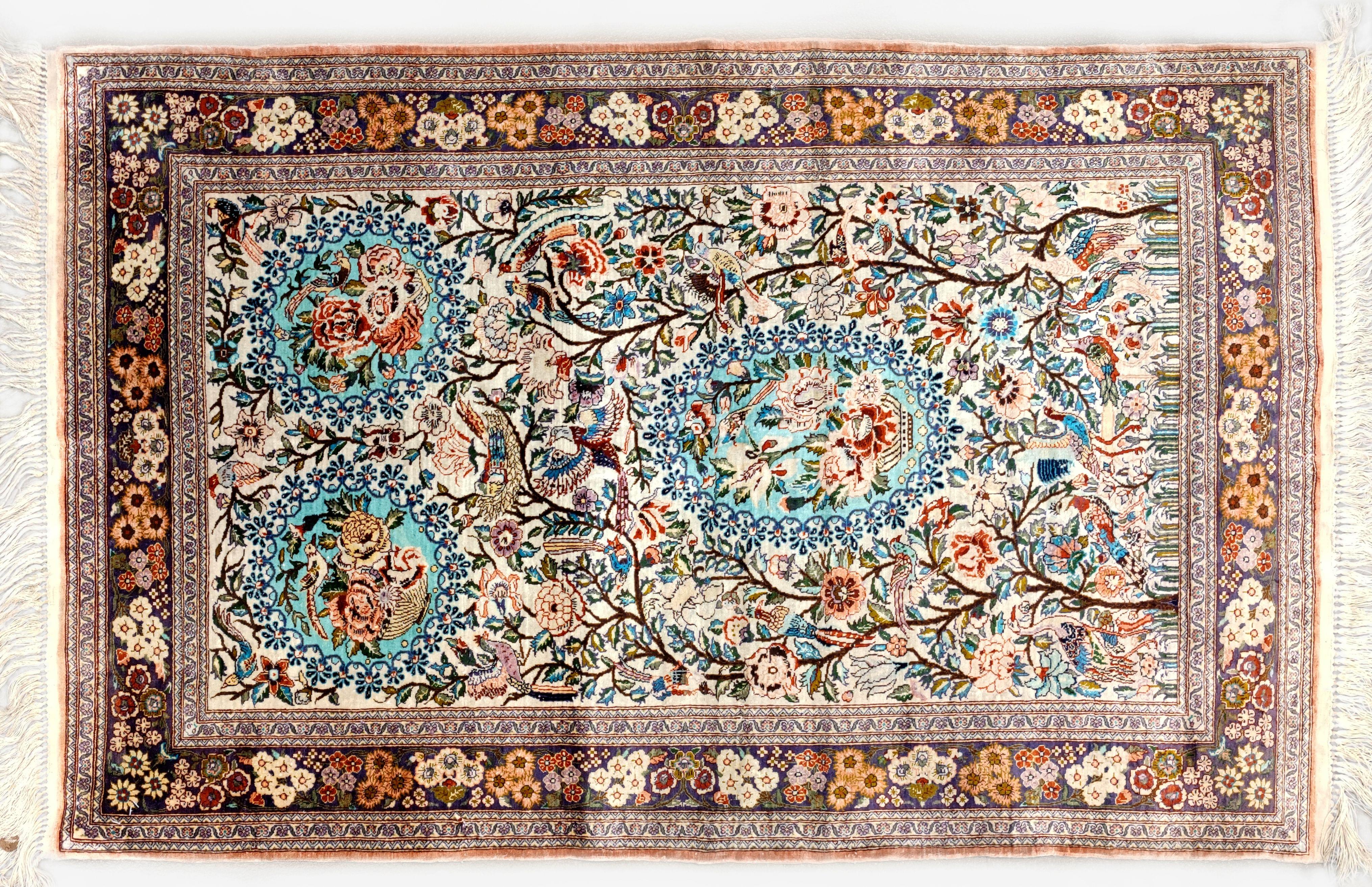 Laine et soie à motifs de fleurs sur fond beige, bordure à décor...