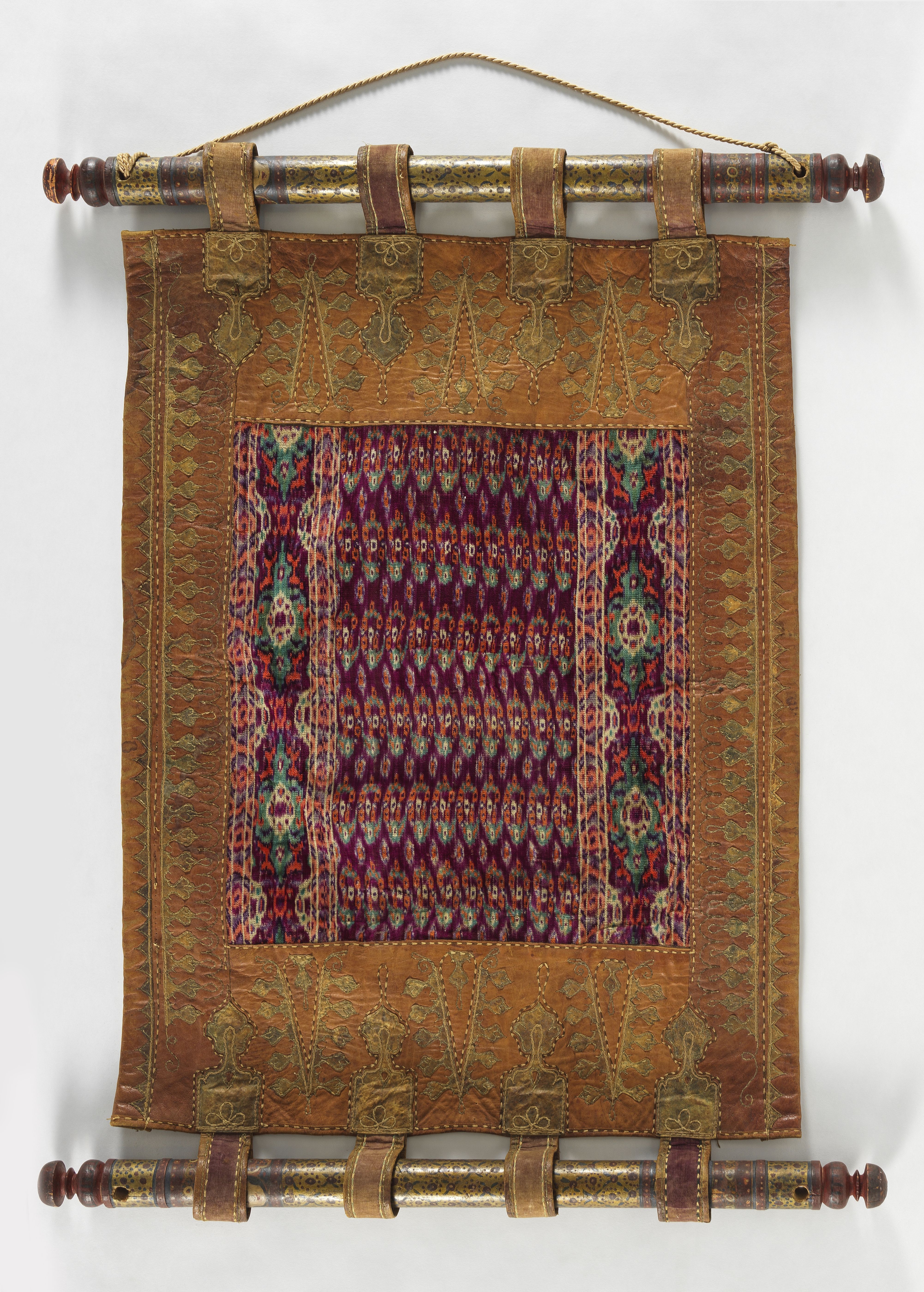 Laine à motifs géométriques et cuir, deux rouleaux de bois polyc...