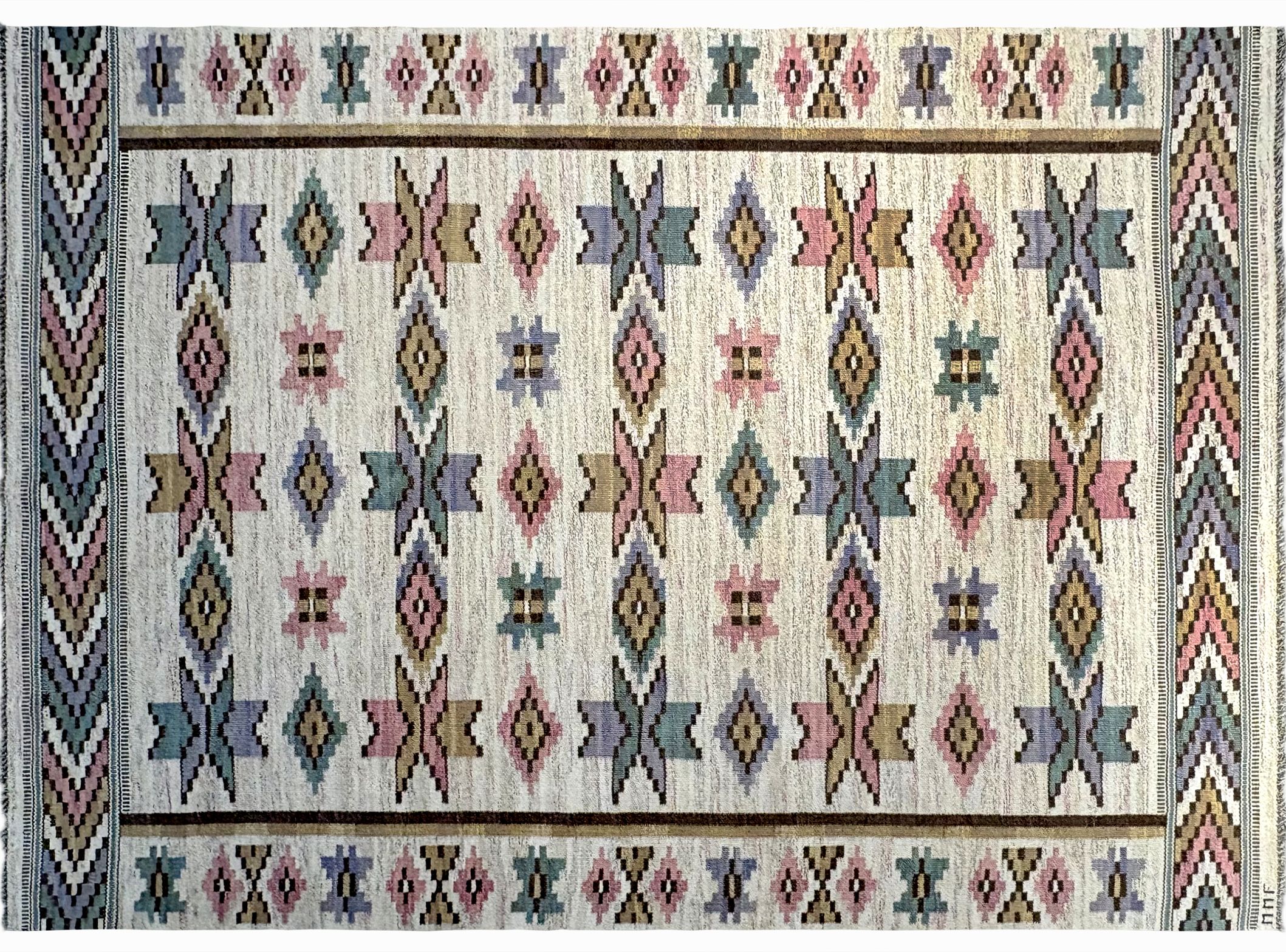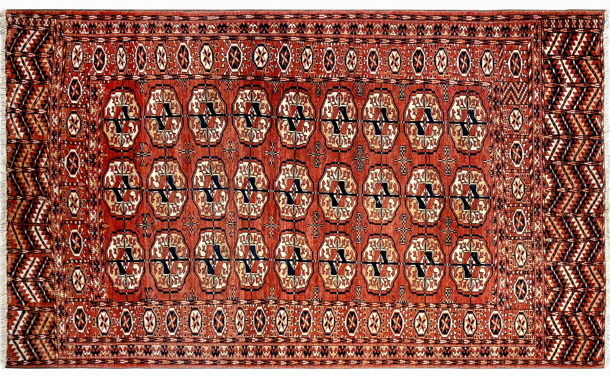 Laine à motifs de lignes et médaillons sur fond brique, 170x105...